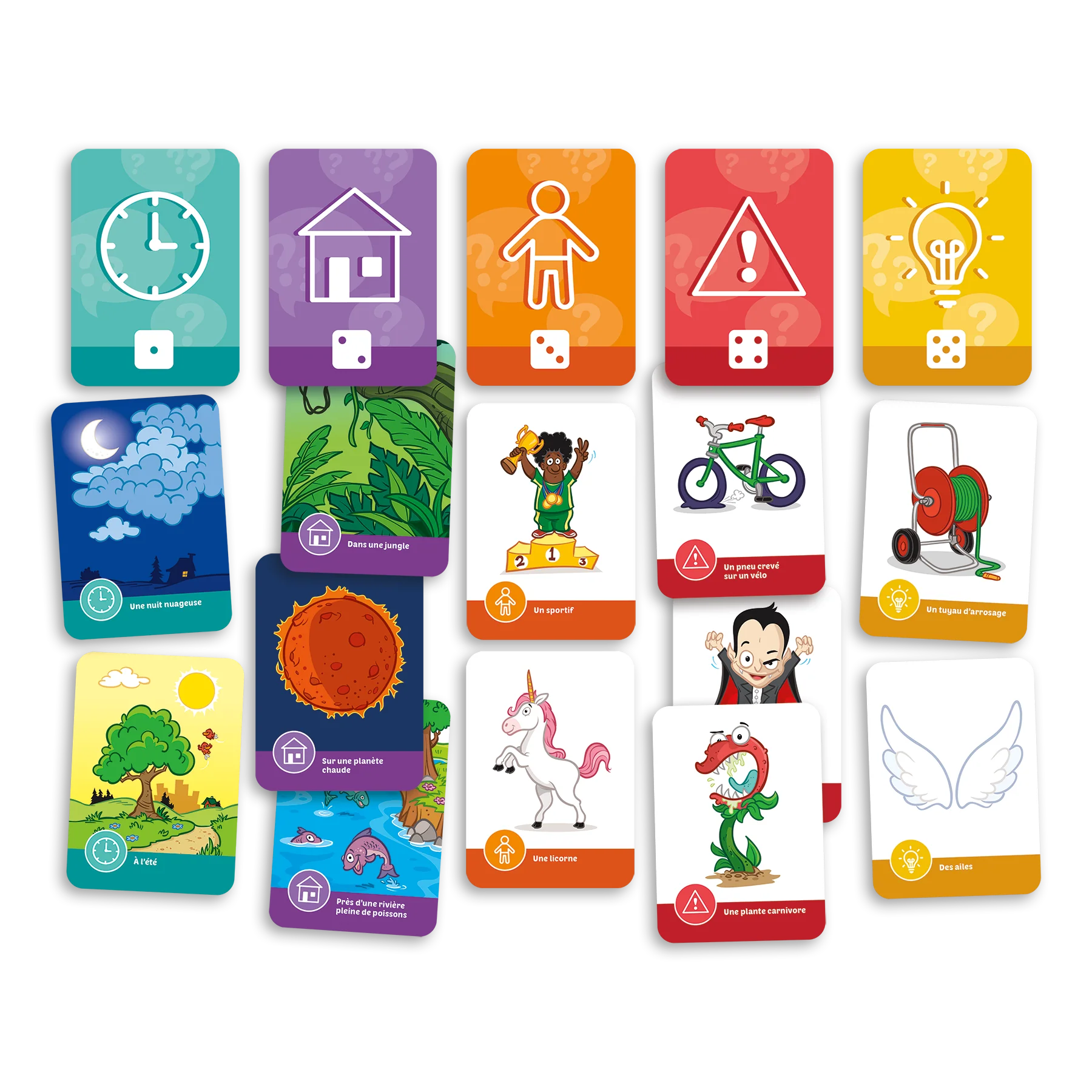 Fais appel à ton imagination pour créer l’histoire la plus amusante! Récolte des cartes qui correspondent au personnage, au lieu, au temps, au problème et à la solution de ton histoire. Raconte-la ensuite aux autres joueurs!