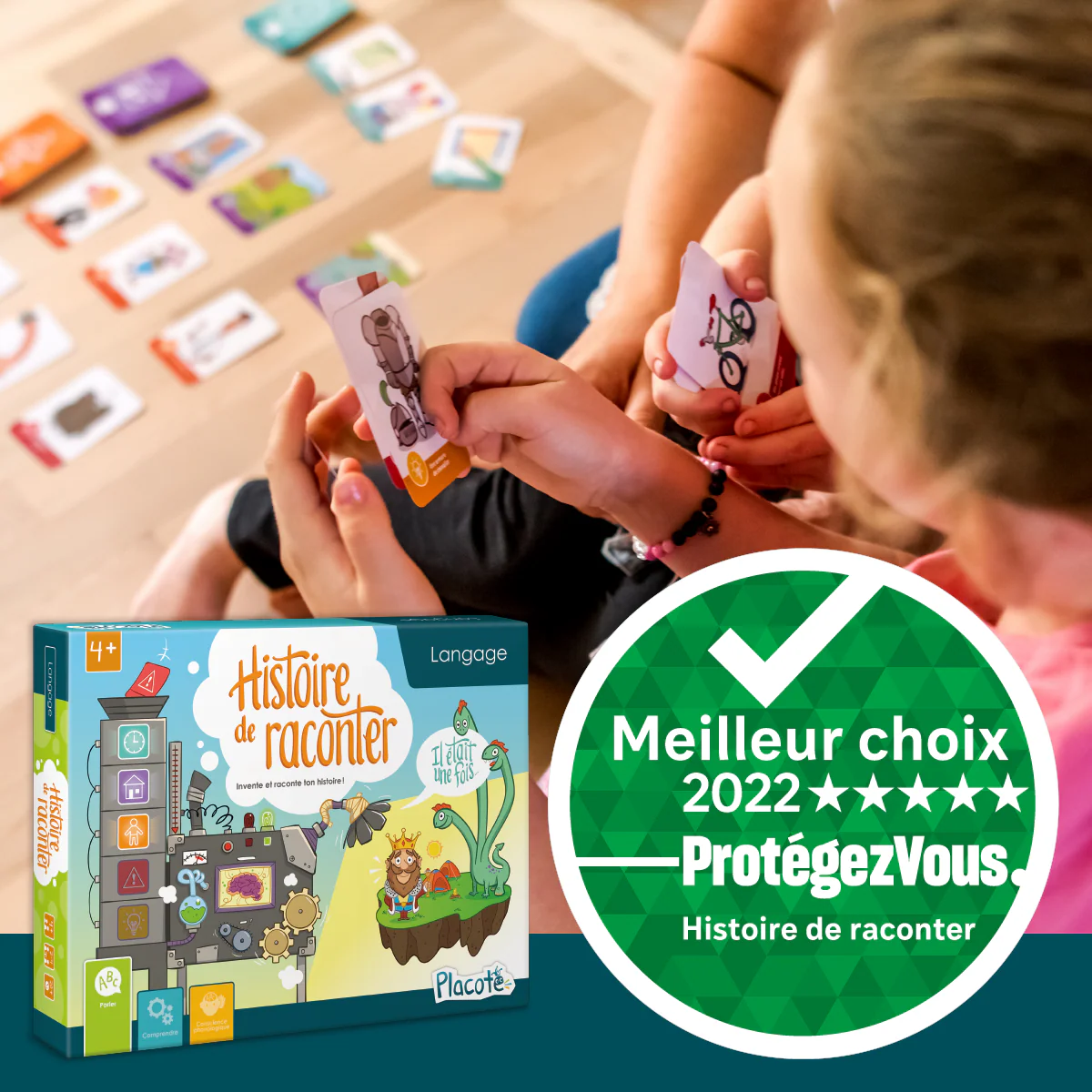 Histoire de raconter est conçu pour aider les enfants de 4 à 9 ans à développer leur habileté à raconter une histoire à l’oral. Ils doivent inventer un récit qu’ils composent à partir de cartes qu’ils récoltent en alternance avec les autres joueurs. Les cartes représentent les éléments de base du récit et sont placées sur une planche de jeu, ce qui permet aux enfants de visualiser leur histoire au fur et à mesure qu’elle se forme et de la raconter en y intégrant tous les éléments.