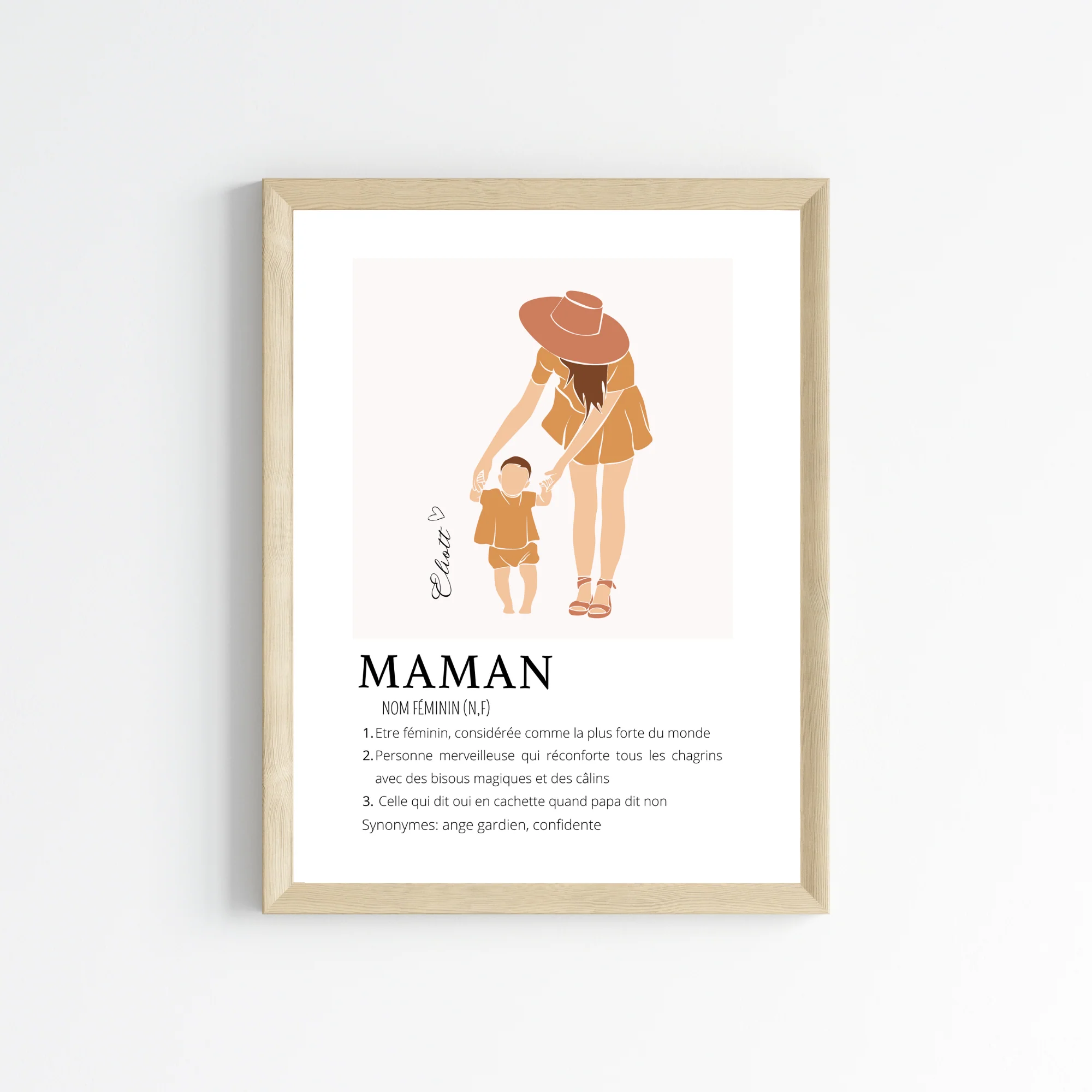 Offrez cette jolie affiche avec une définition de « Maman » accompagnée d’une illustration abstraite. Personnalisez-la en ajoutant le prénom d’un enfant ou en modifiant les définitions et titres. Parfait pour toutes les occasions : Noël, baptême, anniversaire, Fête des Mères, etc.