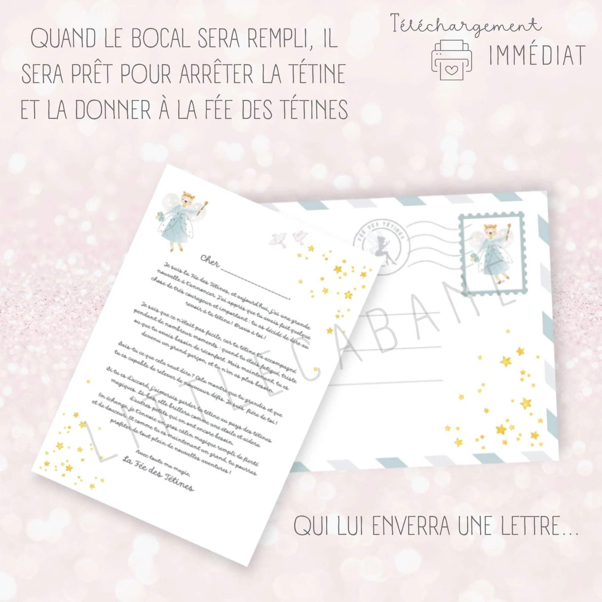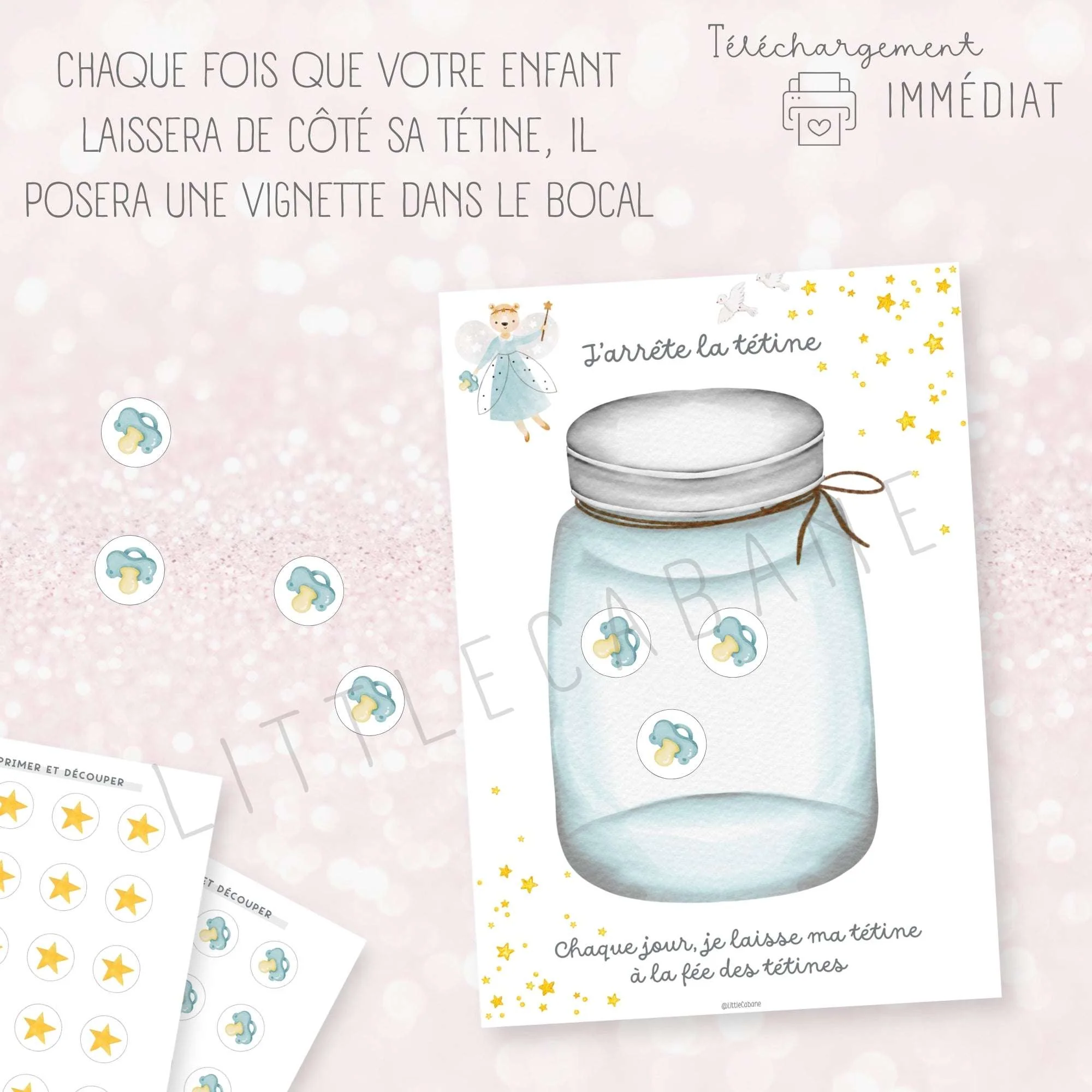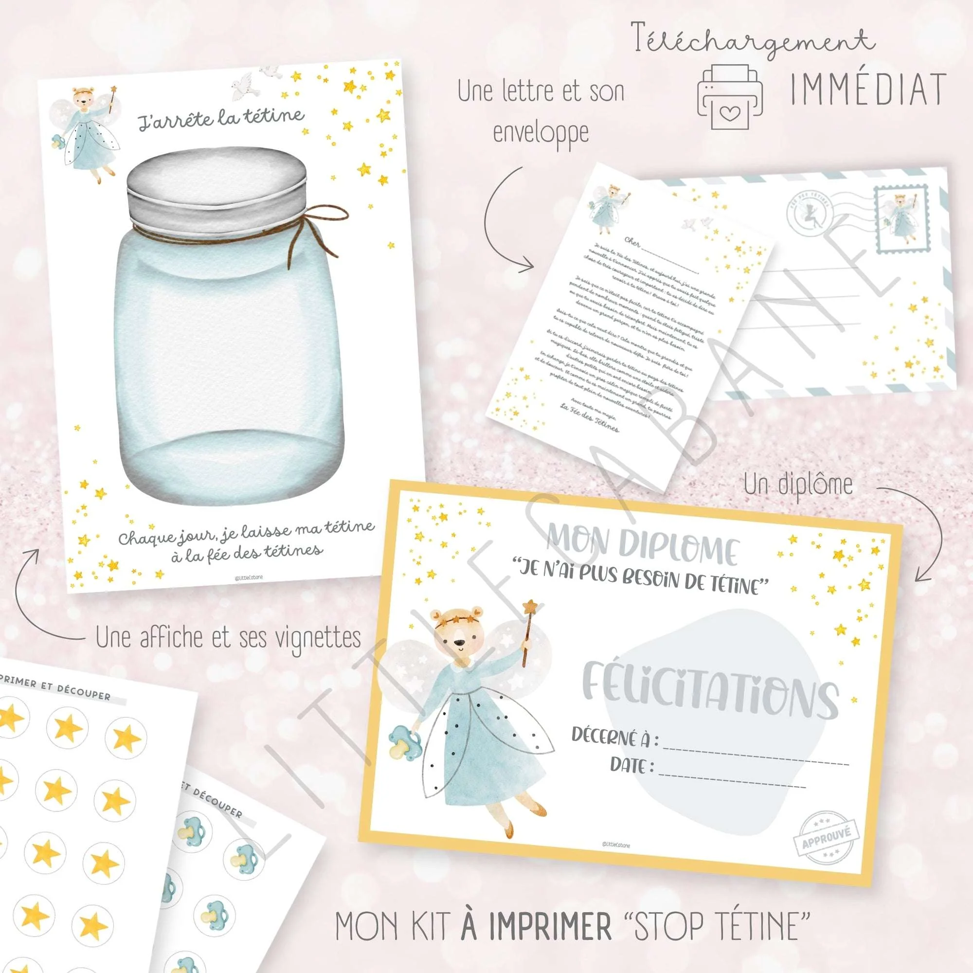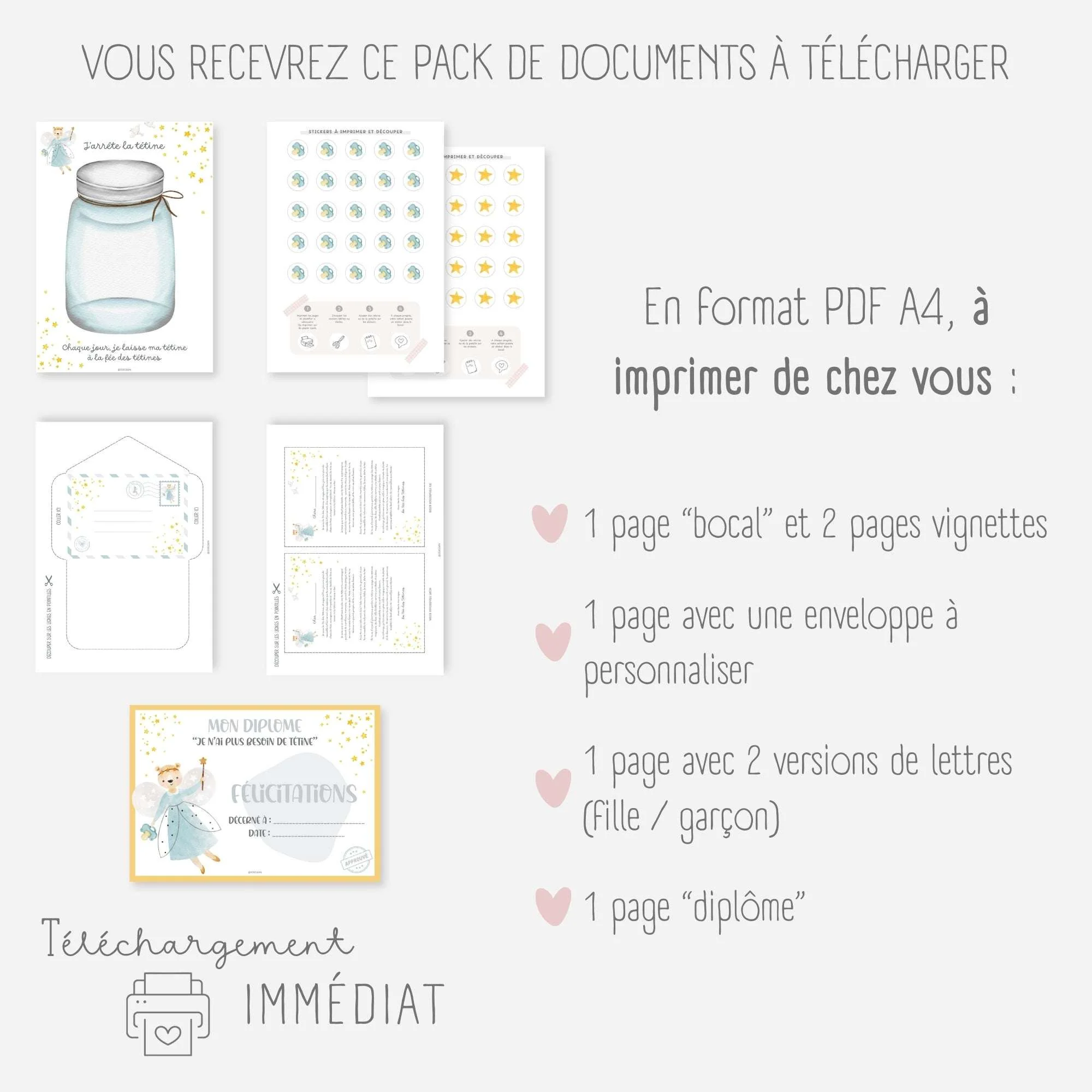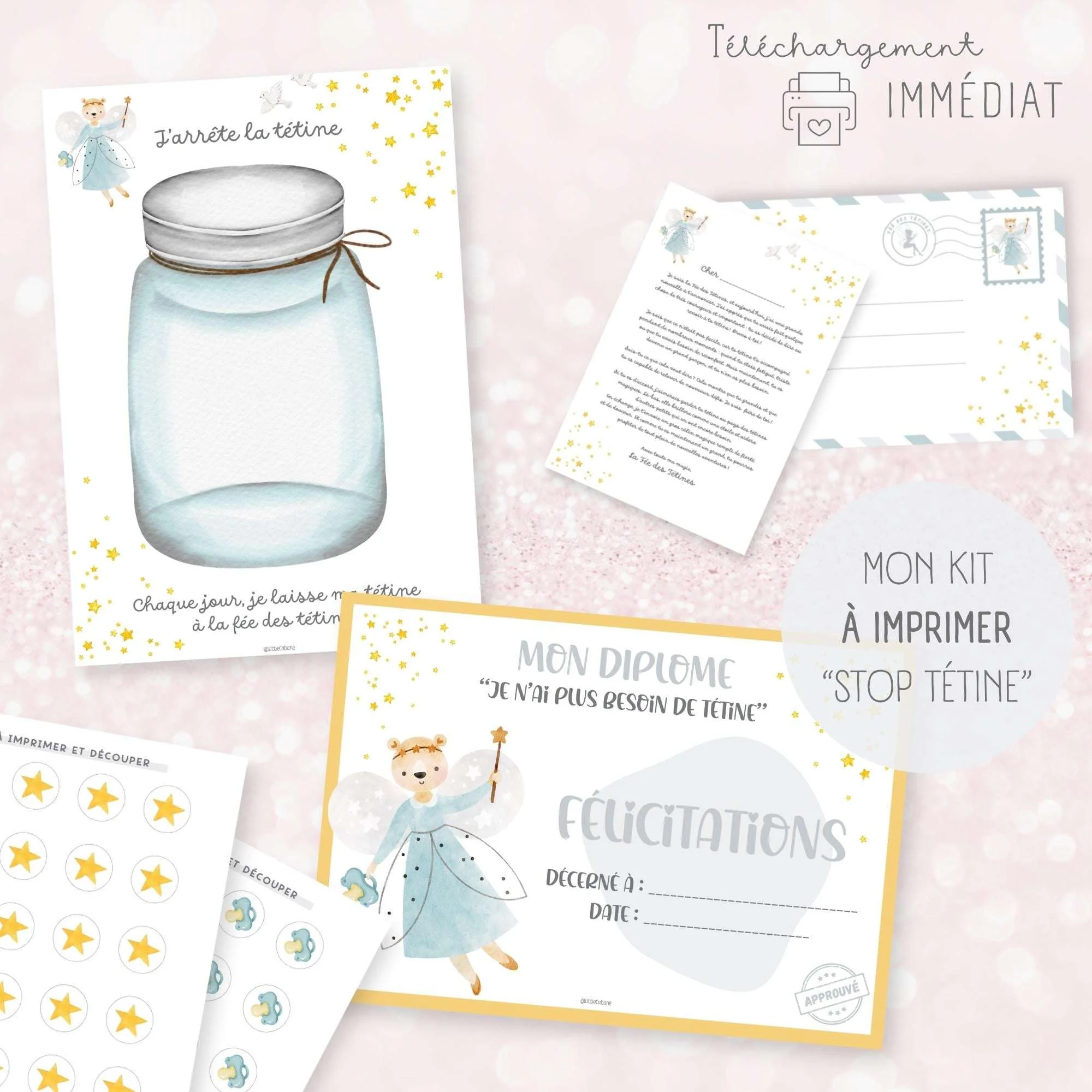Aidez votre enfant à dire au revoir à sa tétine de manière ludique et positive grâce à ce kit composé d’une affiche, une lettre de la fée des tétines et un diplôme à imprimer. À chaque étape, célébrez ses progrès, il sera fier de lui !