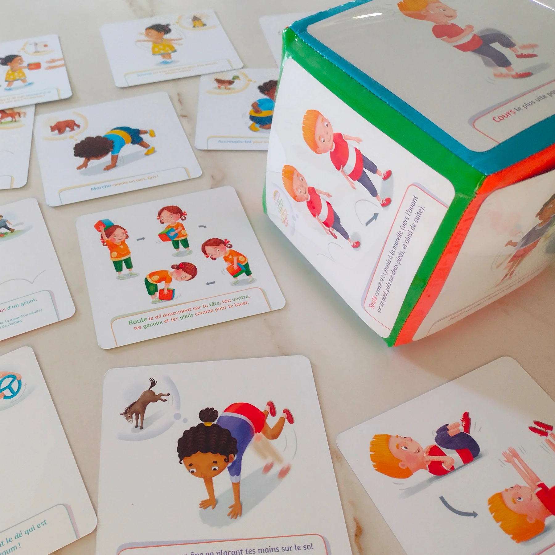 Lance le dé en l’air et reproduis l’action illustrée! Rampe en imitant un train qui entre dans un tunnel! Tourne comme une toupie sur toi-même! Tiens-toi en équilibre sur un pied comme un flamant rose! Marche comme un crabe sans que tes fesses touchent le sol! Réalise toutes sortes de mouvements amusants avec ou sans l’aide d’un adulte!