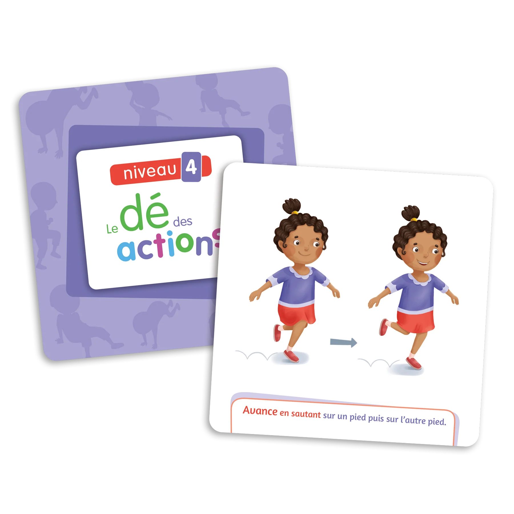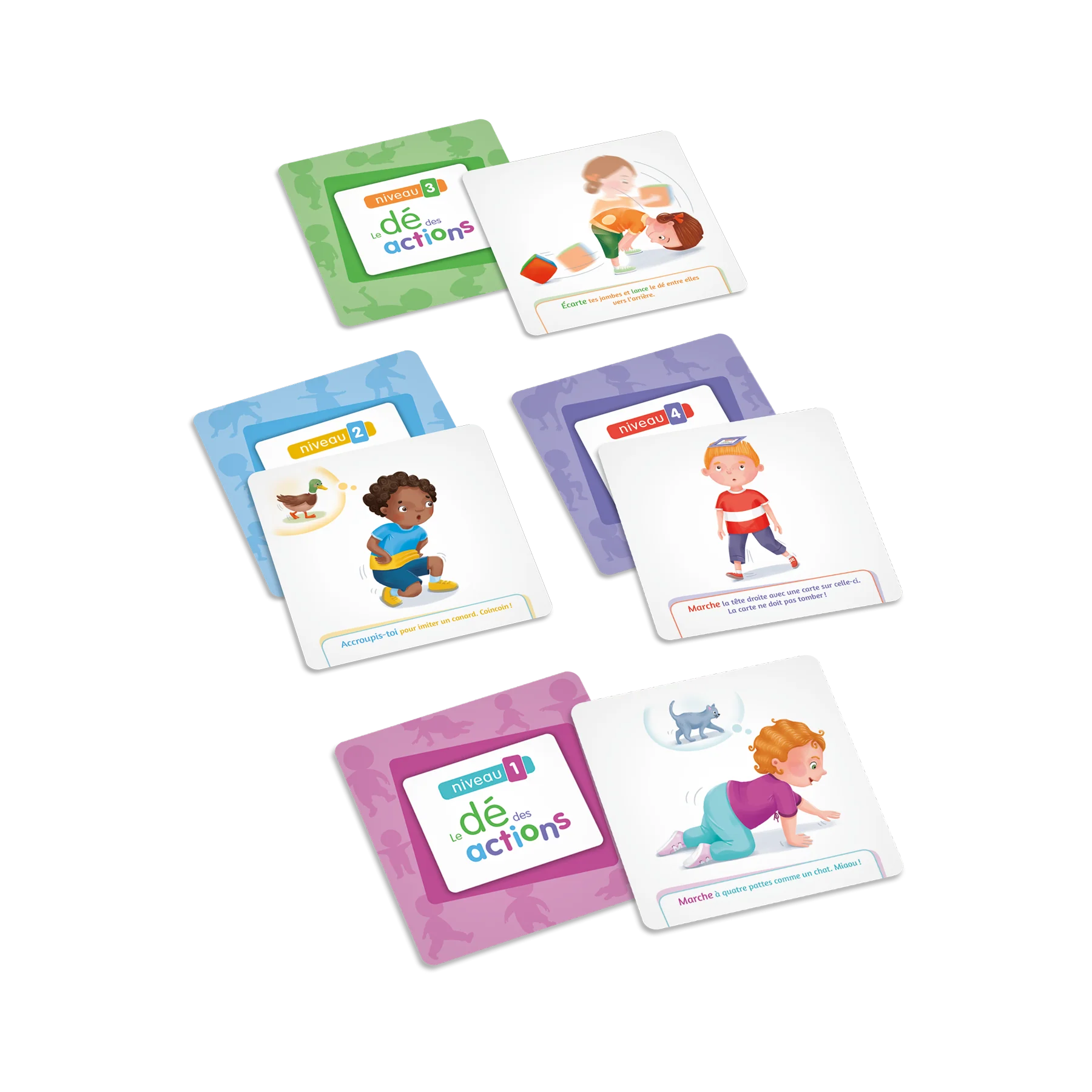- Le niveau 3 (cartes vertes) s’adresse aux enfants de 3 à 4 ans et propose des actions telles que se tenir en équilibre sur un pied, lancer ou attraper le dé, marcher sur la pointe des pieds et sauter à pieds joints.