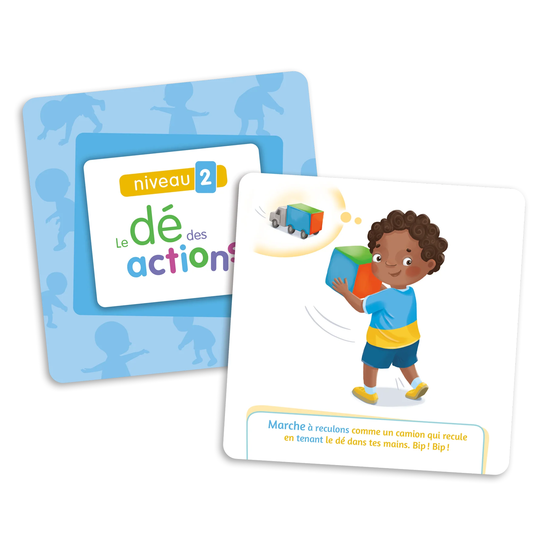 - Le niveau 2 (cartes bleues) s’adresse aux enfants de 2 à 3 ans et propose des actions telles que marcher à reculons, s’accroupir, tourner et galoper.