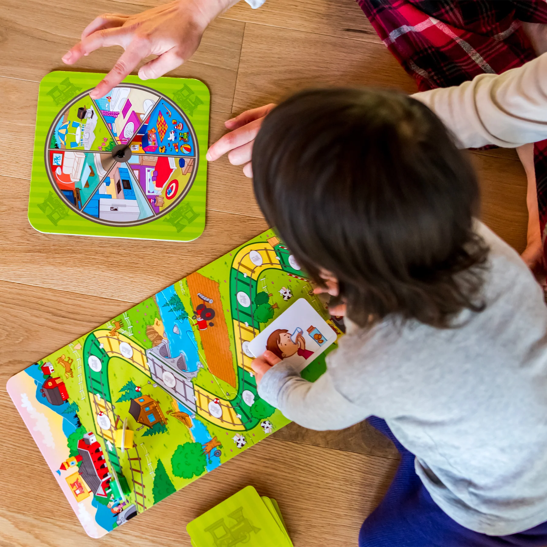 Le train des phrases est conçu pour aider les enfants de 3 à 5 ans à faire des phrases plus longues. Les roulettes de lieux et de temps permettent aux enfants d’ajouter un complément aux phrases illustrées sur les cartes-images. Les phrases ainsi obtenues sont parfois réalistes, parfois farfelues, ce qui ajoute un aspect amusant au jeu.