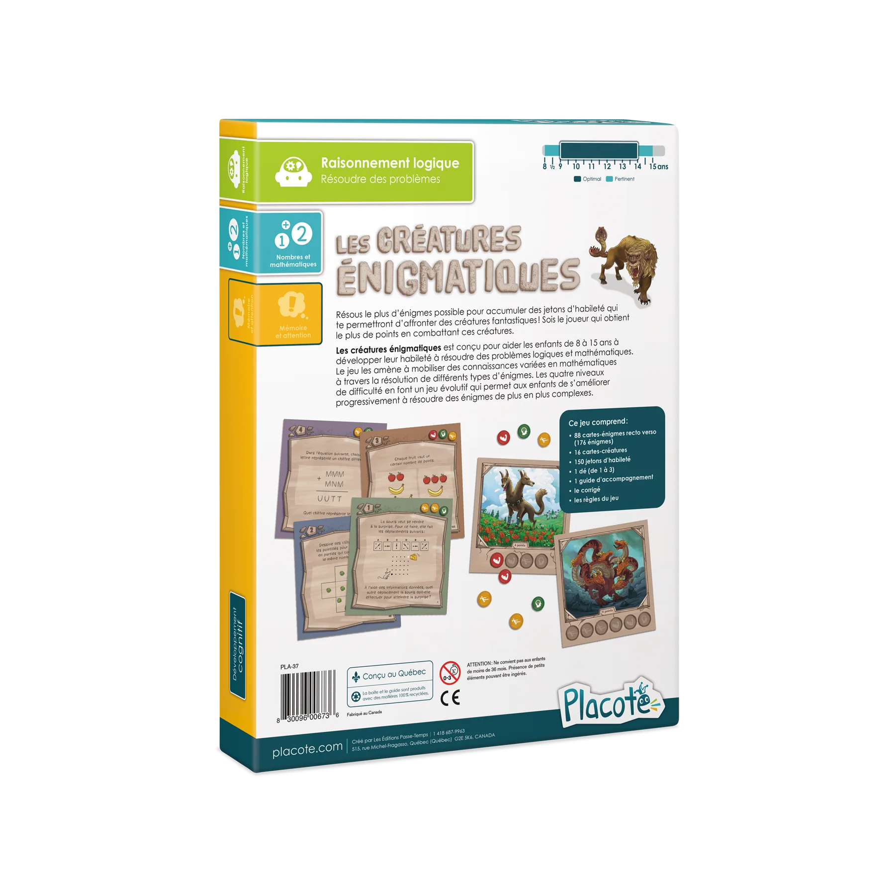 Les créatures énigmatiques est conçu pour aider les enfants de 8 à 15 ans à développer leur habileté à résoudre des problèmes logiques et mathématiques. Le jeu les amène à mobiliser des connaissances variées en mathématiques à travers la résolution de différents types d’énigmes. Les quatre niveaux de difficulté en font un jeu évolutif qui permet aux enfants de s’améliorer progressivement à résoudre des énigmes de plus en plus complexes.