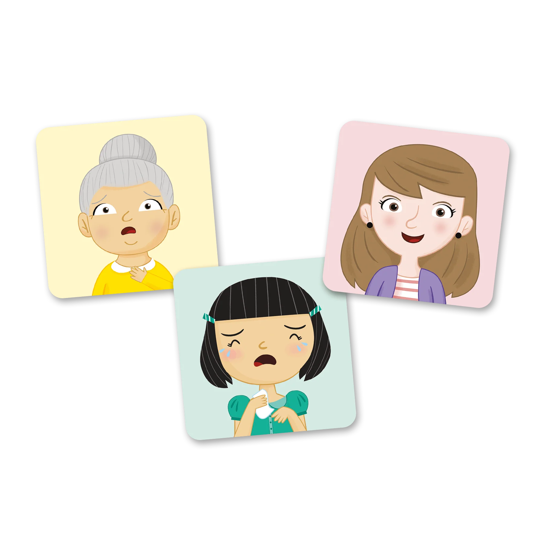 Apprends à reconnaitre les émotions de base! Tu peux associer et nommer les émotions en plaçant les cartes aux bons endroits. Sauras-tu trouver les deux fillettes tristes identiques, ou encore le petit garçon et le grand-père en colère? Par la suite, associe chaque image d’émotion à une cause.