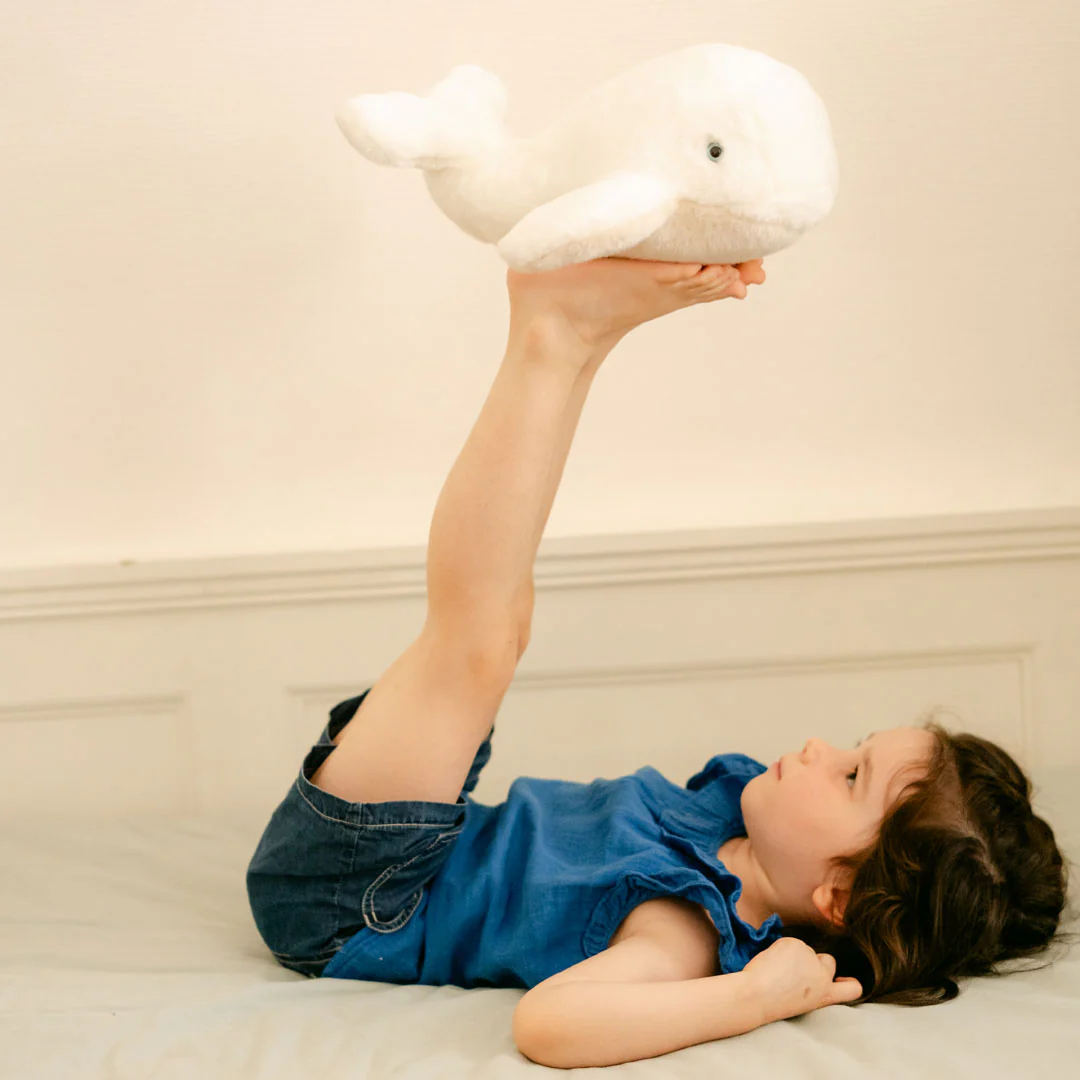 Je suis disponible en deux tailles, pour que chacun puisse trouver la baleine qui lui correspond : une version mini pour les petits bras, et une plus grande pour les grandes aventures.