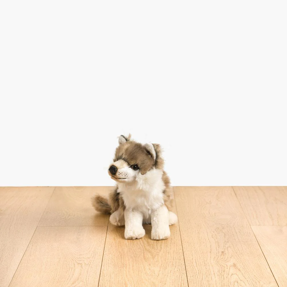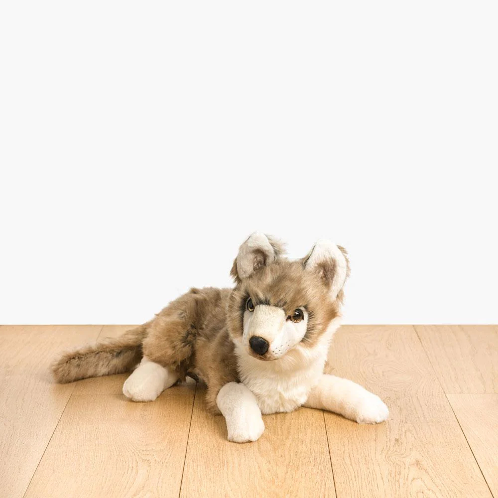 Je suis Gaspard, le loup en peluche ! Avec mes yeux expressifs plus vrais que nature, mes paupières en cuir finement cousues, mon pelage grisonnant doux et soyeux semblable à une fourrure et mes oreilles redressées, on pourrait croire que je sors tout droit de la forêt. Par contre, tu n’as rien à craindre de mes crocs, je suis là pour garder ton sommeil… et te faire beaucoup de câlins !