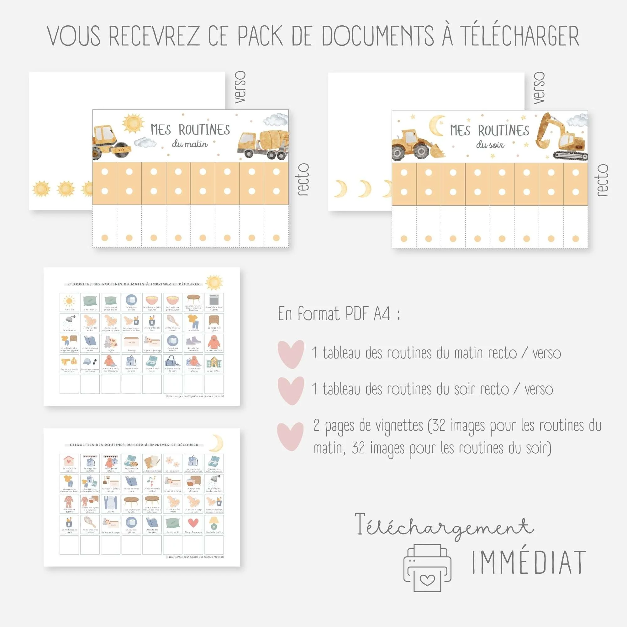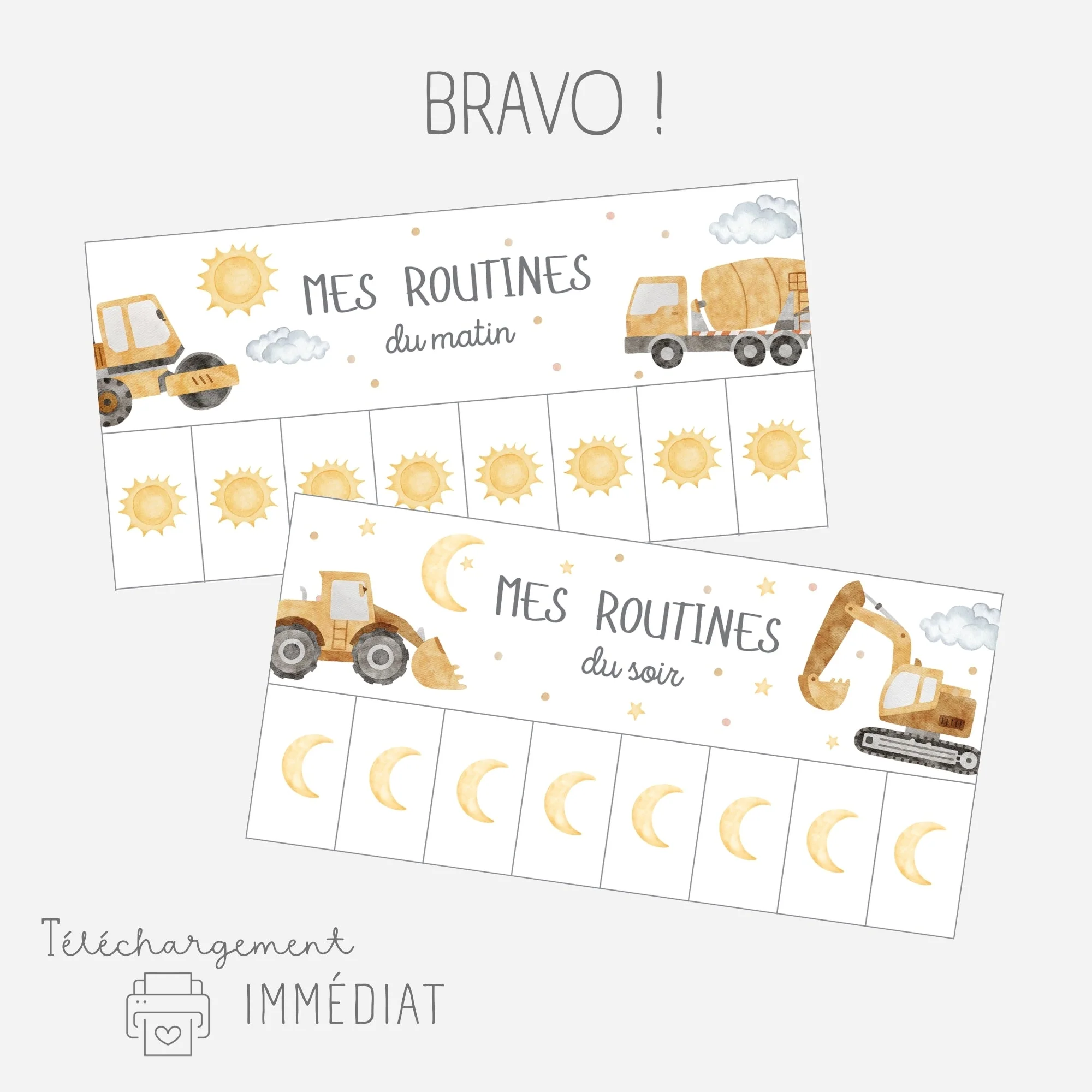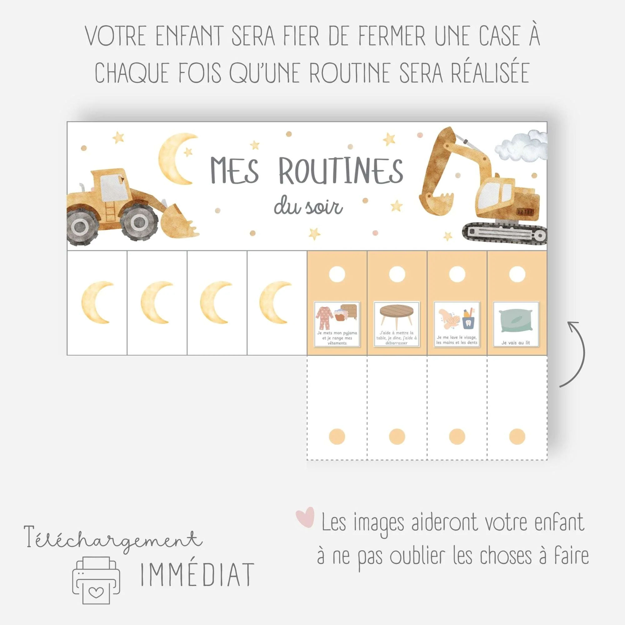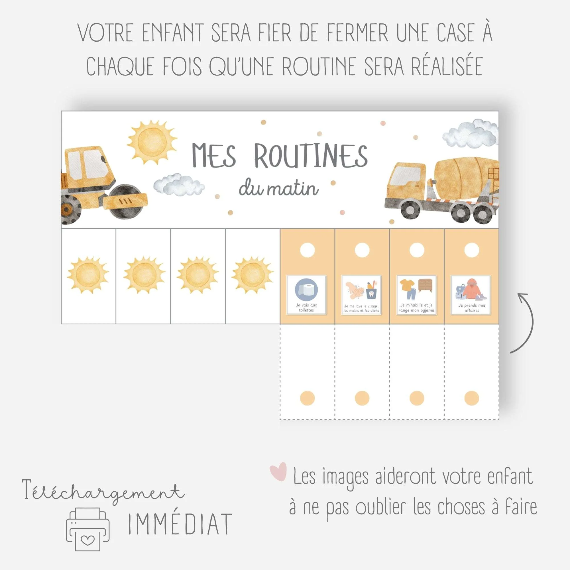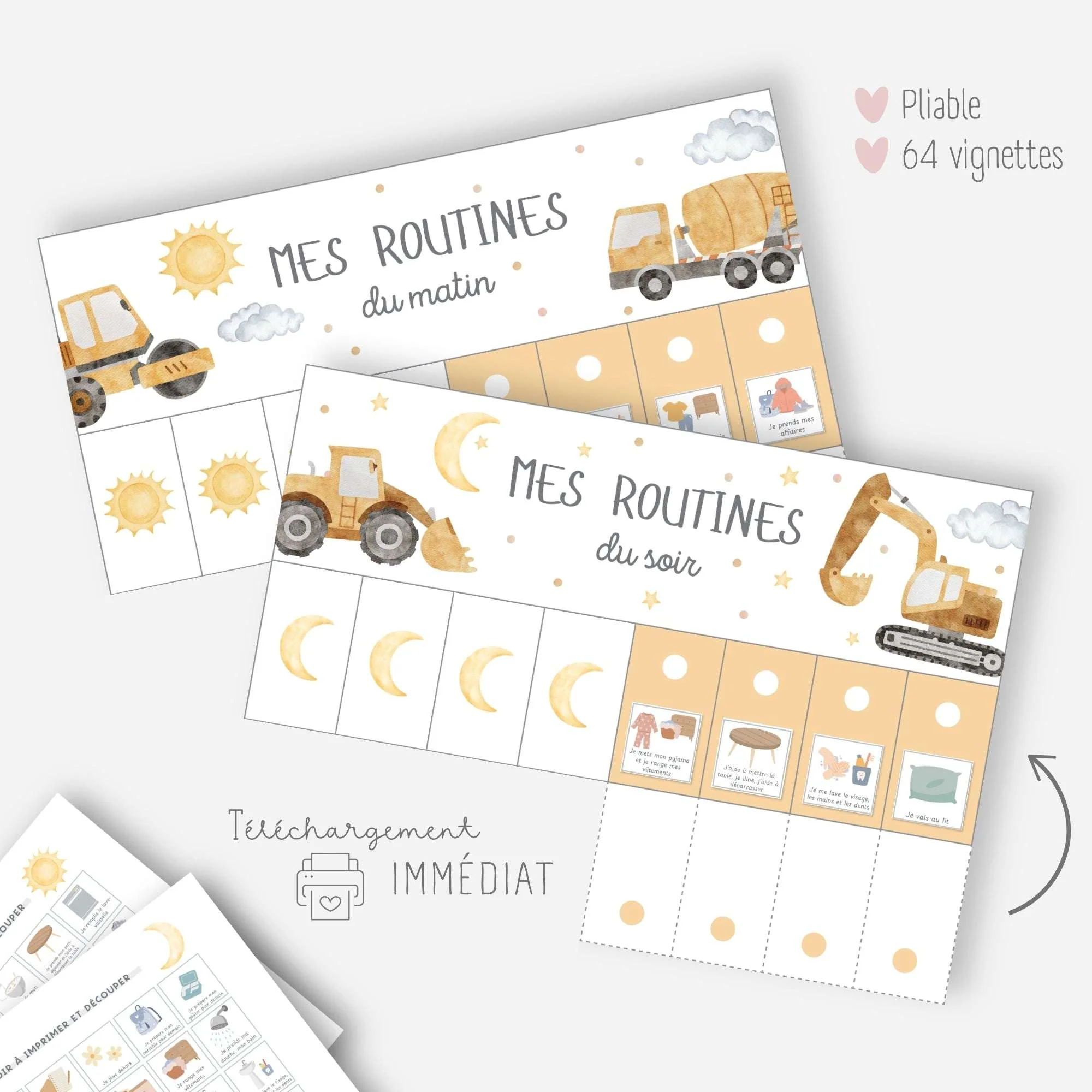 Ces tableaux de routines sur le thème du chantier vont permettre à votre enfant de gagner en autonomie dans les gestes du quotidien. Grâce aux différentes vignettes, personnalisez ces tableaux pour les adapter aux habitudes du matin et du soir de votre enfant. Votre enfant adorera fermer une languette lorsqu’il aura effectué une routine !