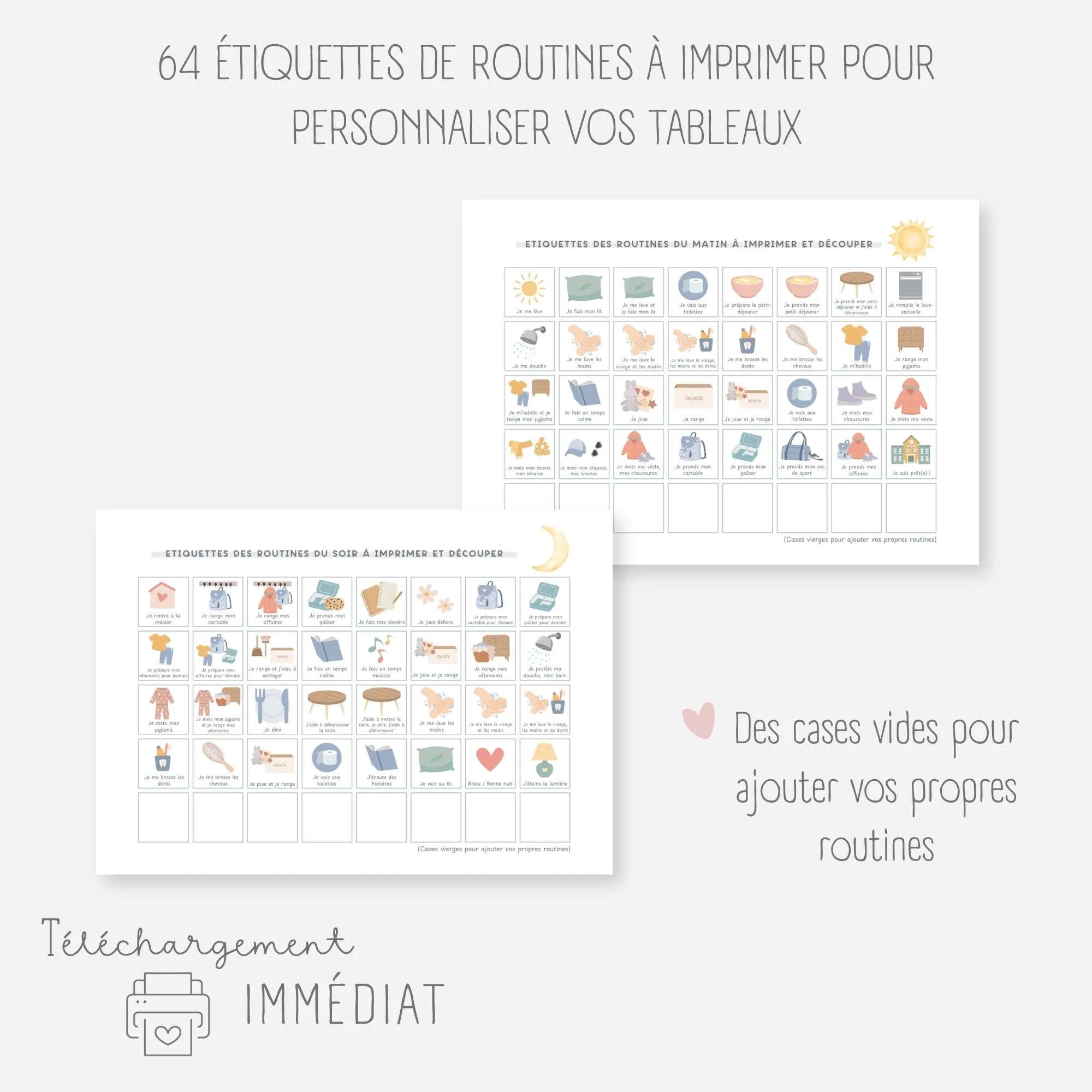 Grâce aux différentes vignettes, personnalisez ces tableaux pour les adapter aux habitudes du matin et du soir de votre enfant. Votre enfant adorera fermer une languette lorsqu’il aura effectué une routine !