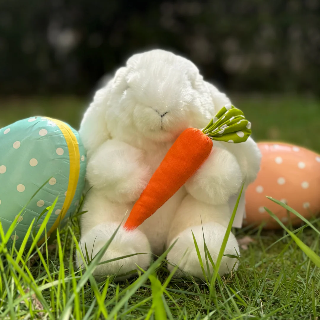 Avec sa carotte orange cousue à la main, Ernest est prêt à célébrer le printemps avec euphorie et légèreté. Son pelage d’une douceur incomparable en fait le compagnon parfait pour des câlins tout doux après la chasse aux œufs.