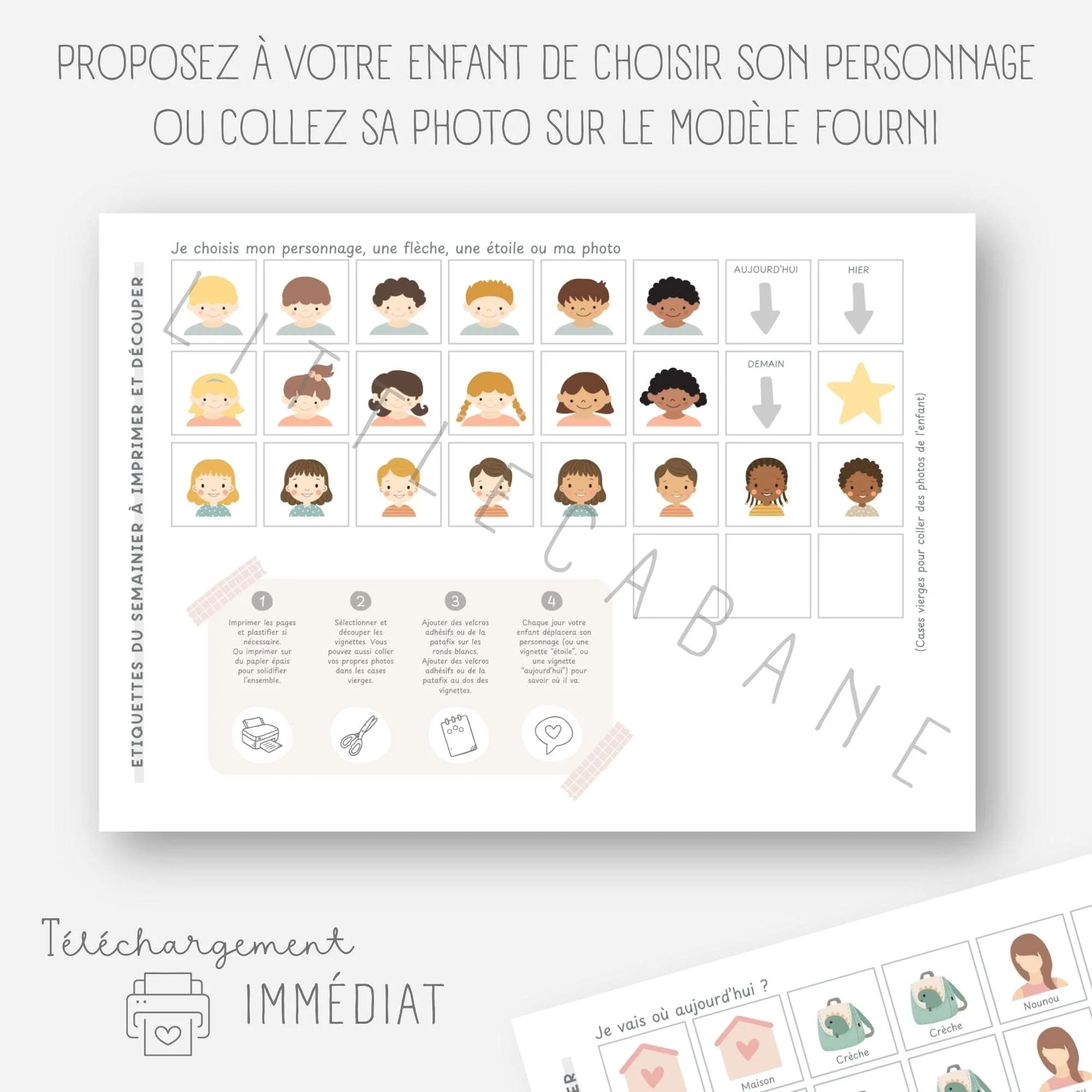 Chaque matin, votre enfant déplacera son personnage sur le tableau Il verra où il passera sa journée (crèche, école, maison…) et sera confiant et rassuré !