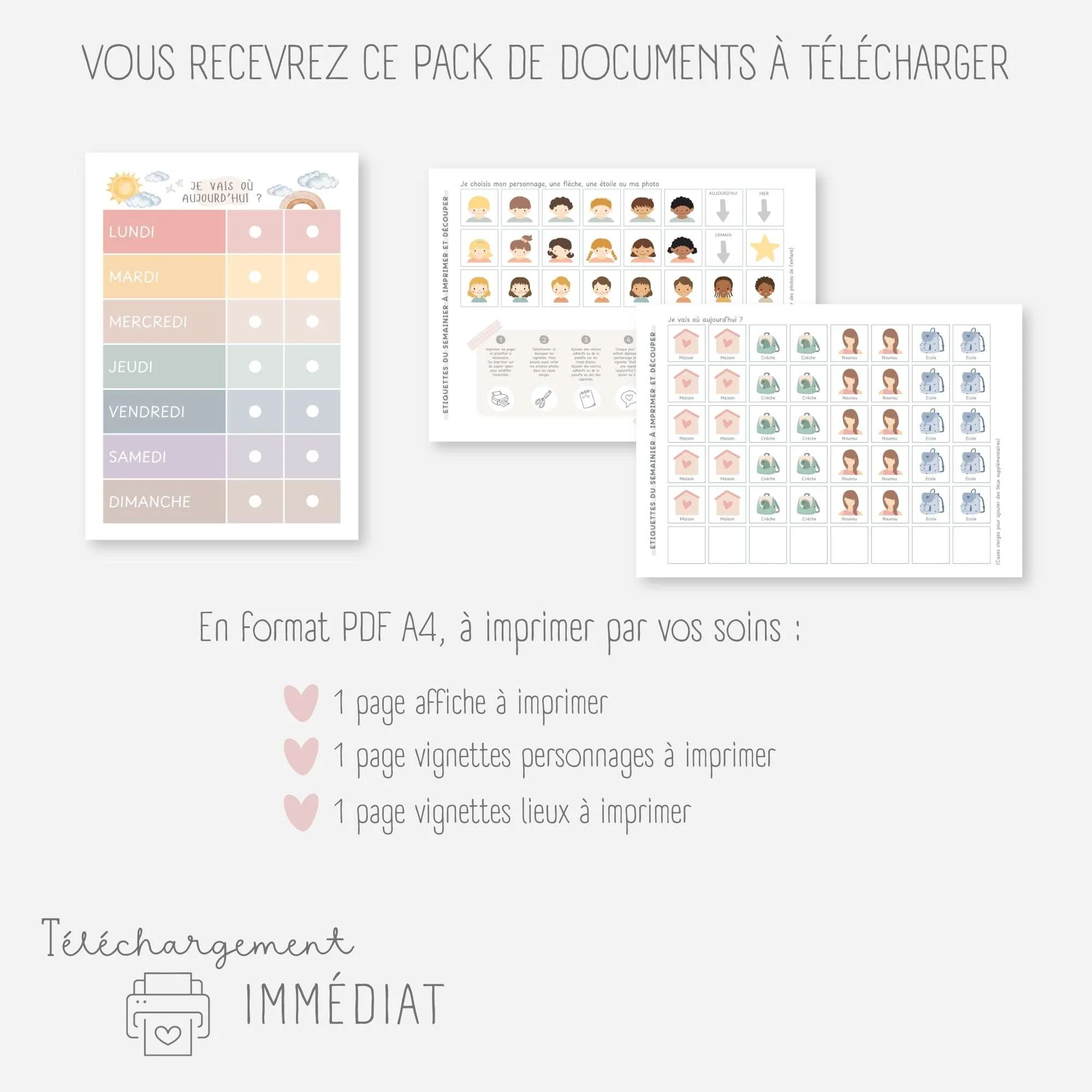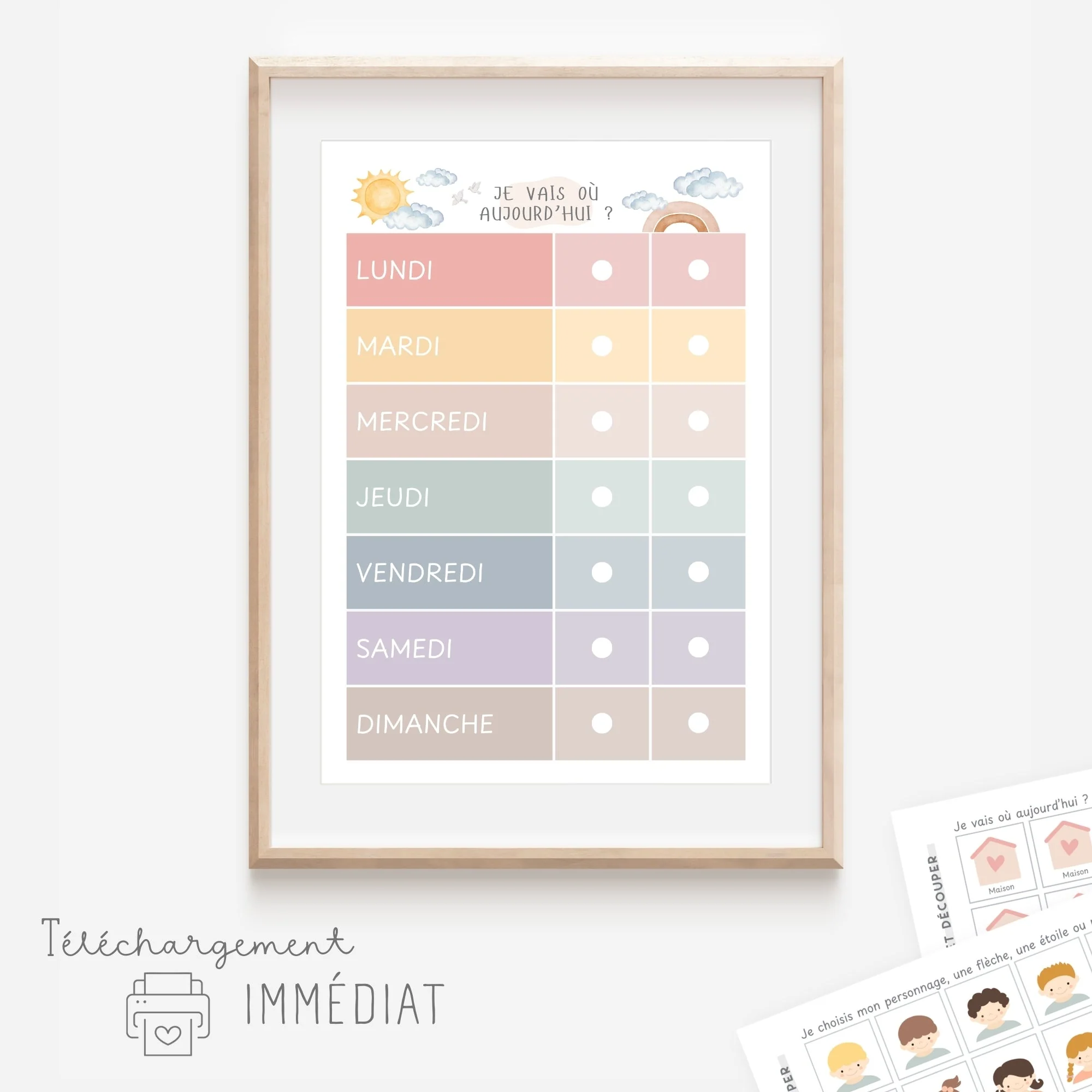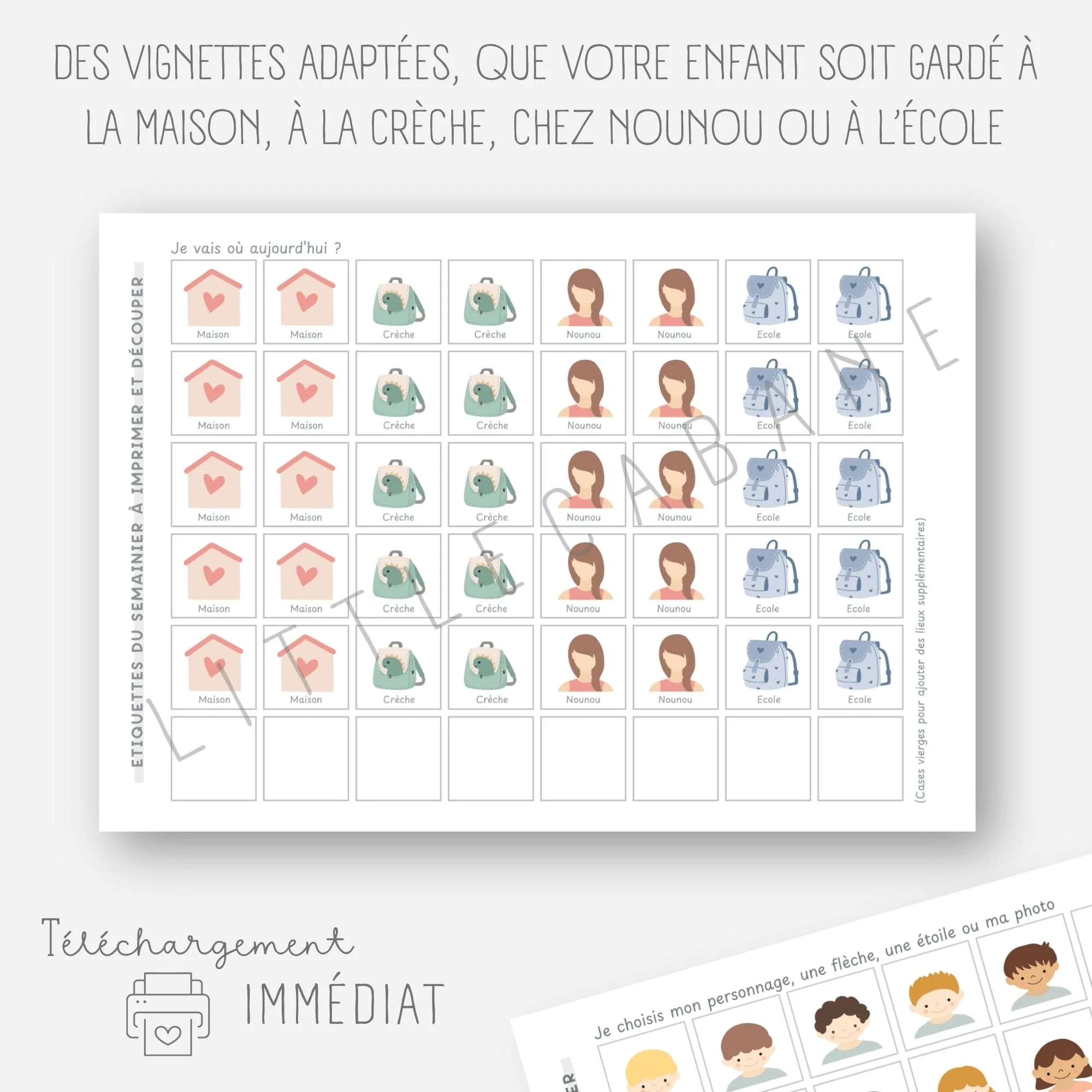 Avec ce semainier à imprimer, aidez votre enfant à se préparer au déroulement de chaque journée et à se repérer dans la semaine.Chaque matin, votre enfant déplacera son personnage sur le tableau Il verra où il passera sa journée (crèche, école, maison…) et sera confiant et rassuré !
