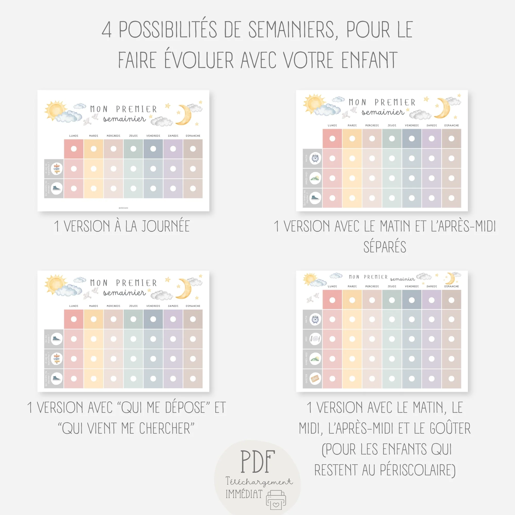 Avec ce semainier, aidez votre enfant à se préparer au déroulement de chaque journée et à se repérer dans la semaine.Chaque matin, votre enfant déplacera son personnage sur le tableau. Il verra où il passera sa journée (crèche, école, maison…) et qui viendra le chercher. Il sera confiant et rassuré ! Inclus : + de […]