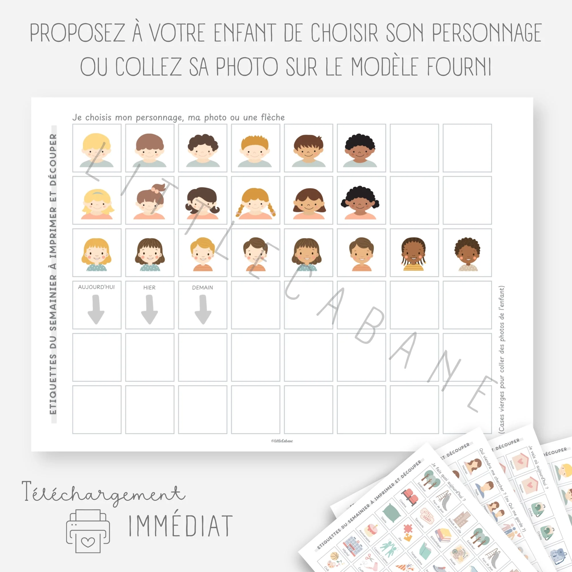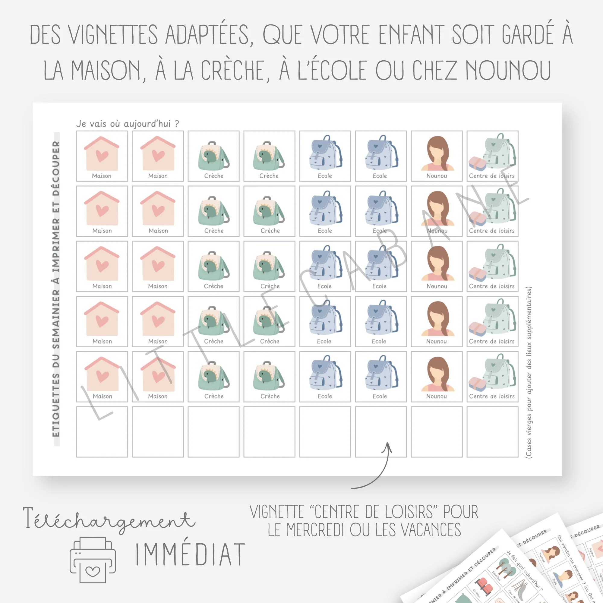 Chaque matin, votre enfant déplacera son personnage sur le tableau. Il verra où il passera sa journée (crèche, école, maison…) et qui viendra le chercher. Il sera confiant et rassuré !