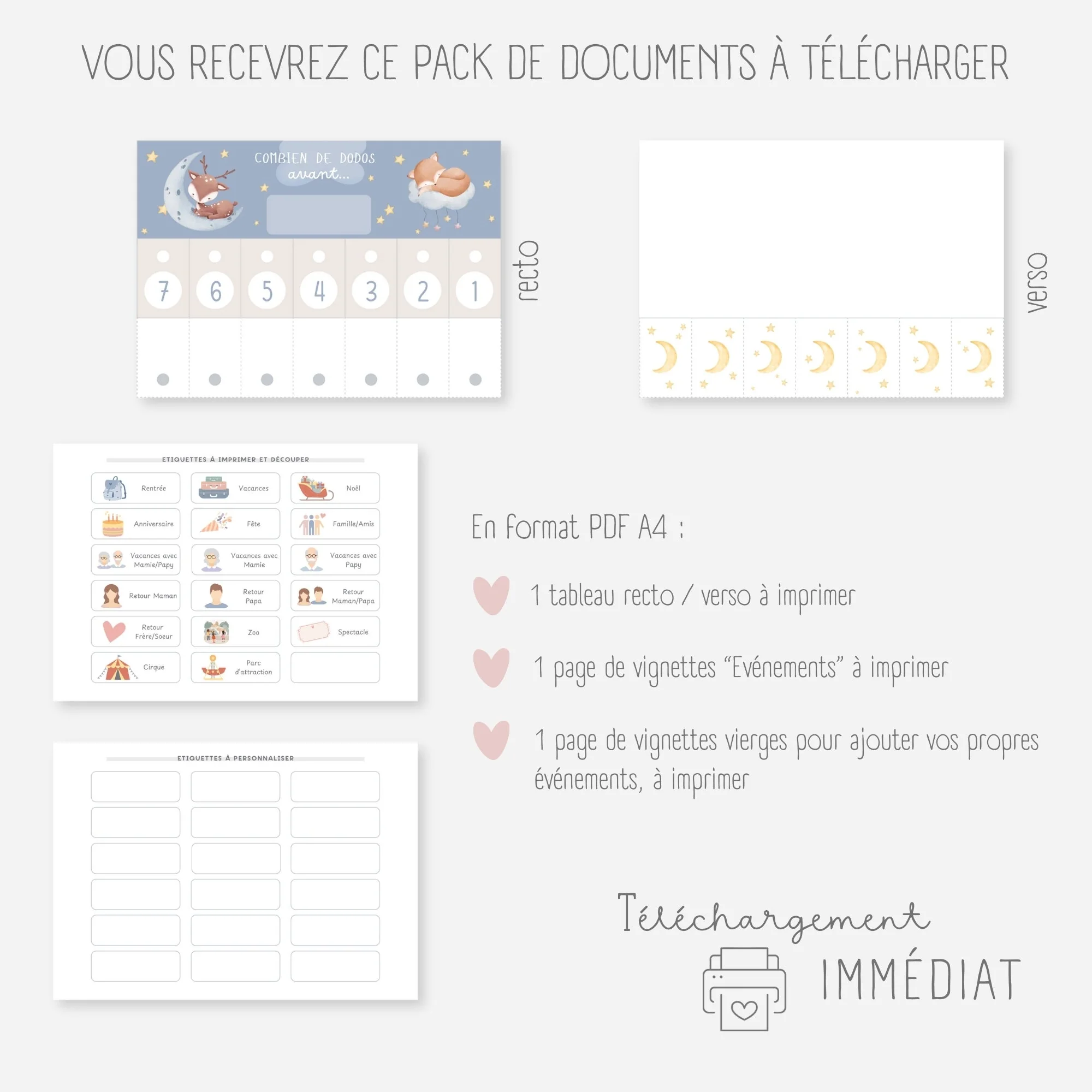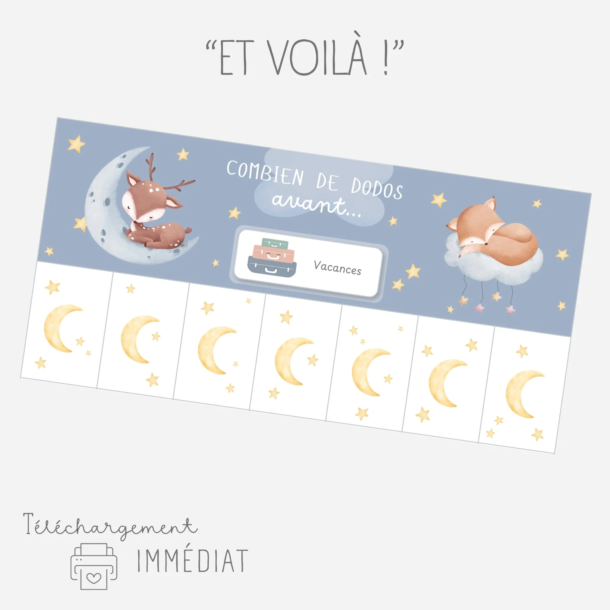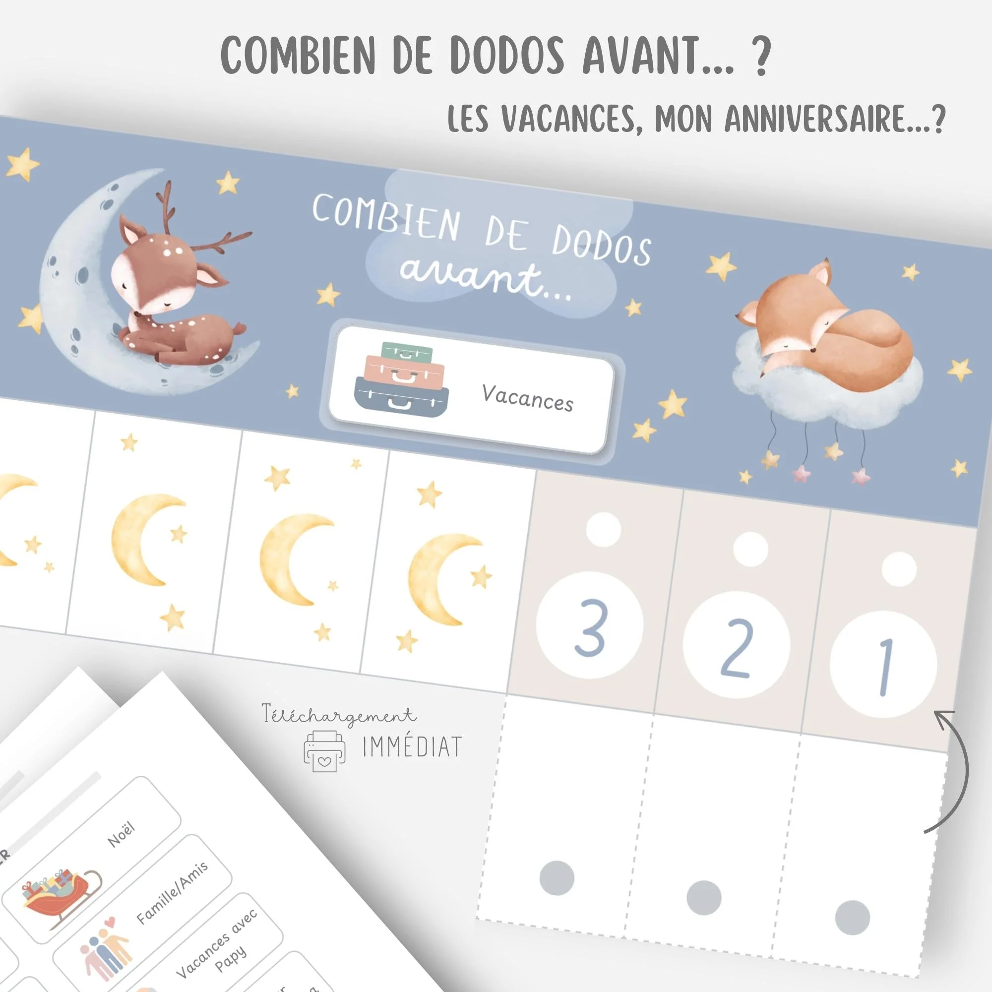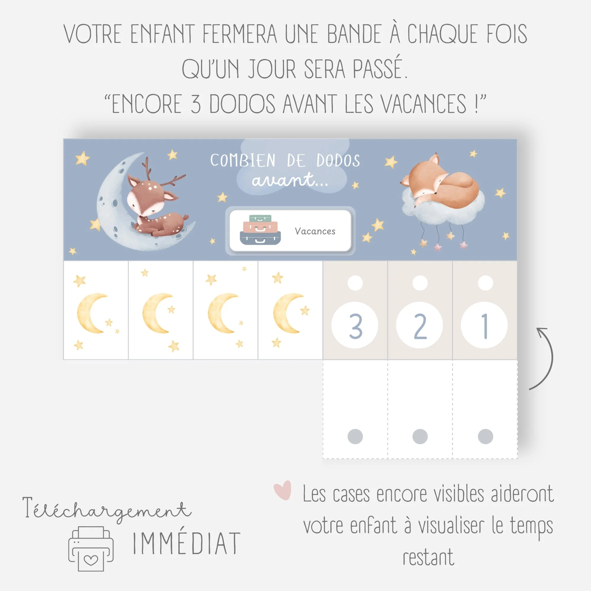 Chaque jour, votre enfant fermera une languette et pourra visualiser concrètement le temps restant (le nombre de dodos) avant l’événement.