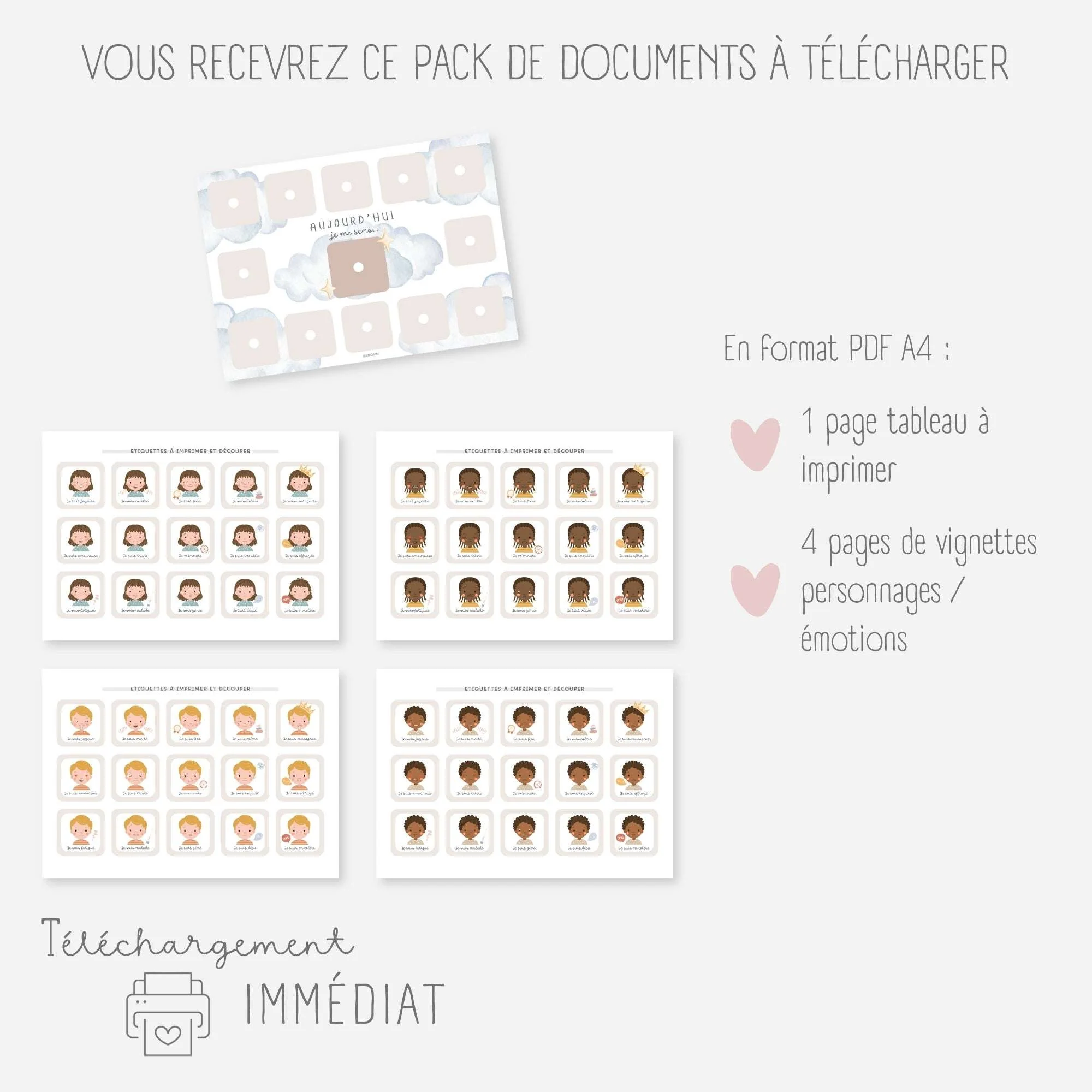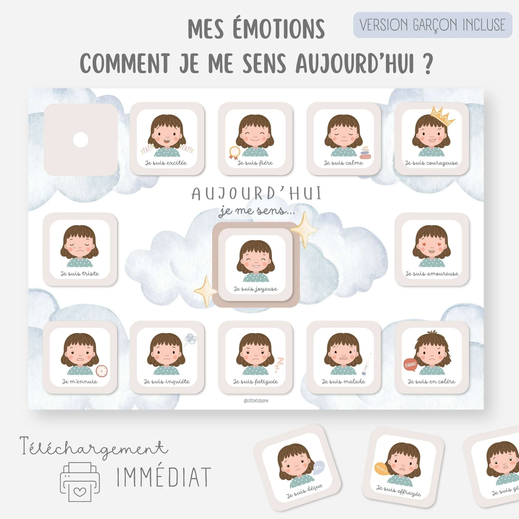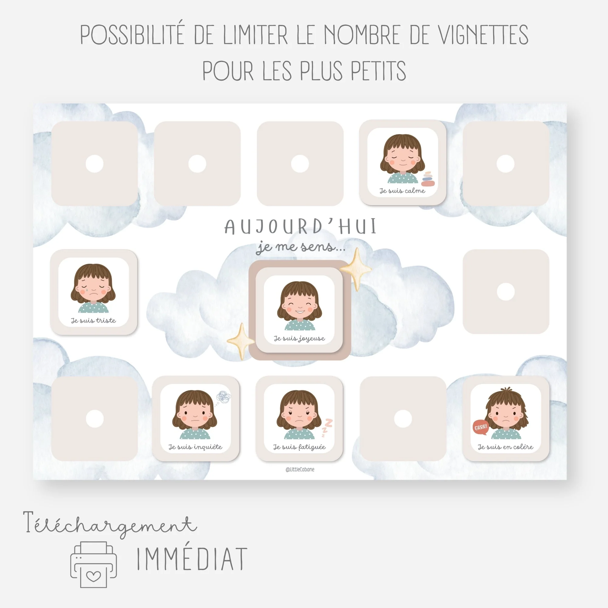 Aidez votre enfant à reconnaître et exprimer ses émotions au quotidien grâce à ce tableau des émotions à imprimer et ses vignettes à positionner.Chaque jour, votre enfant choisira la vignette qui représente son émotion du moment, cela lui permettra de mieux exprimer ce qu’il ressent.