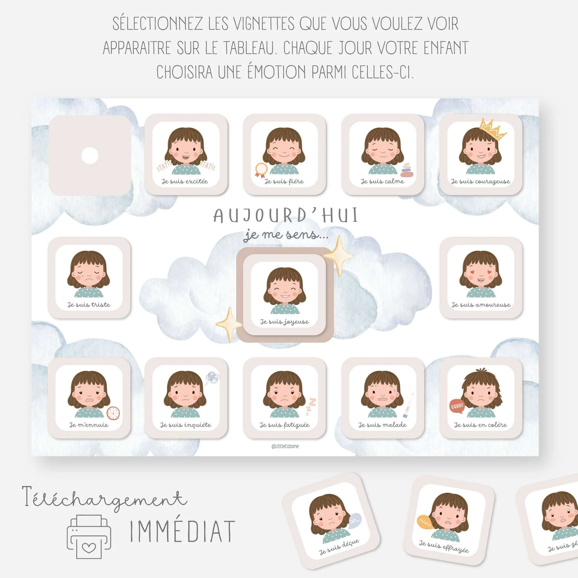 Chaque jour, votre enfant choisira la vignette qui représente son émotion du moment, cela lui permettra de mieux exprimer ce qu’il ressent.