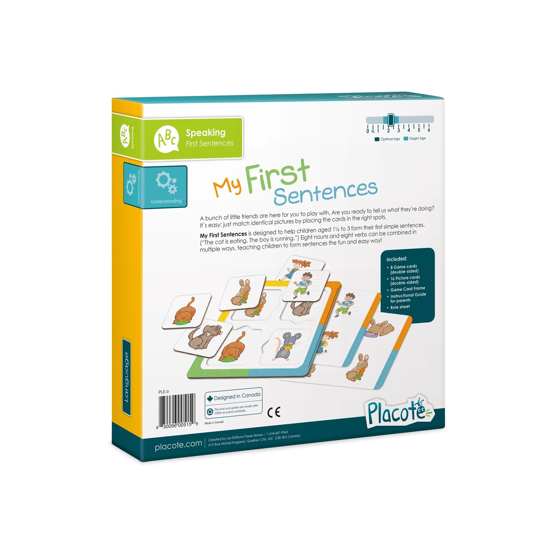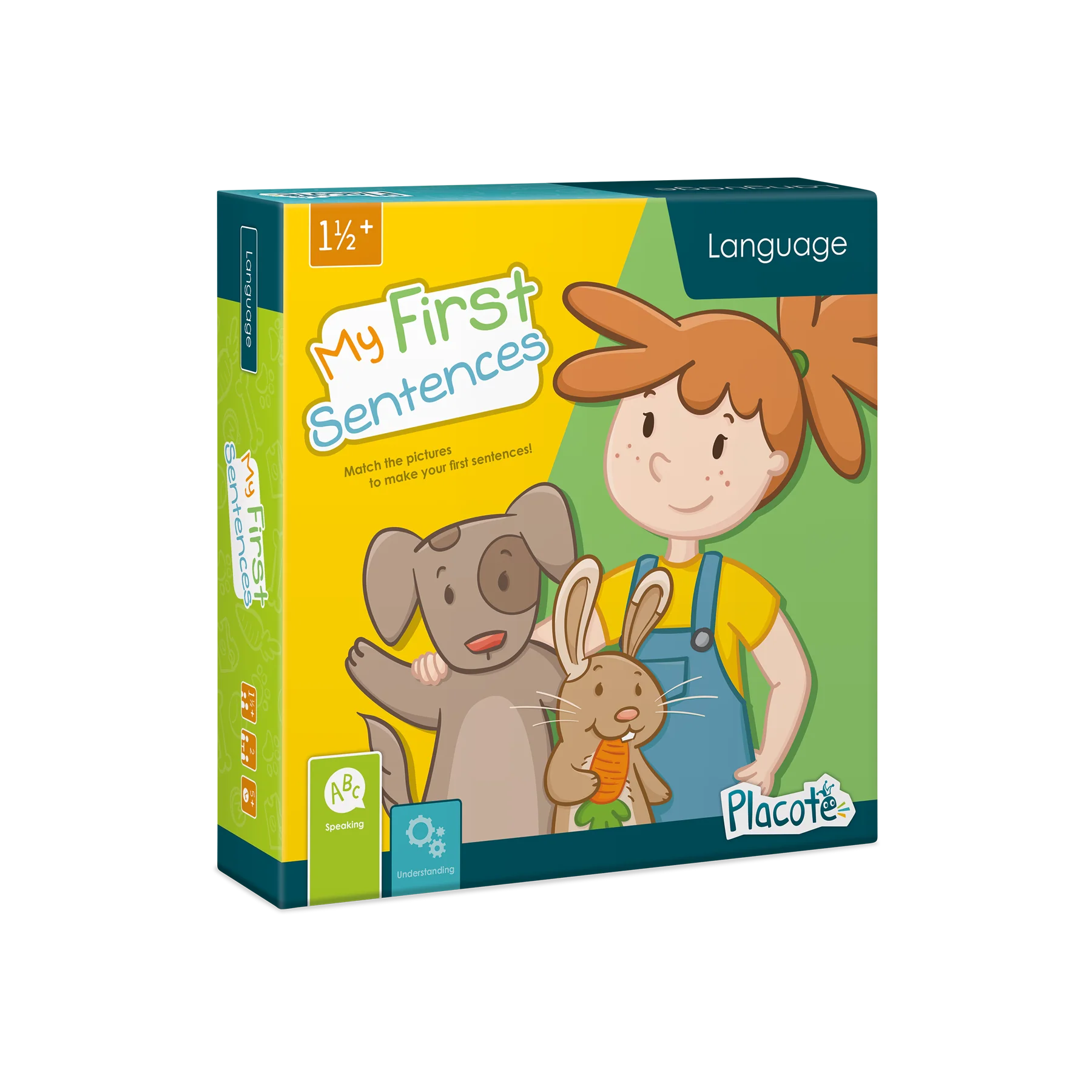 My First Sentences is designed to help children aged 1½ to 3 form their first simple sentences. (“The cat is eating. The boy is running.”) Eight nouns and eight verbs can be combined in multiple ways, teaching children to form sentences the fun and easy way!