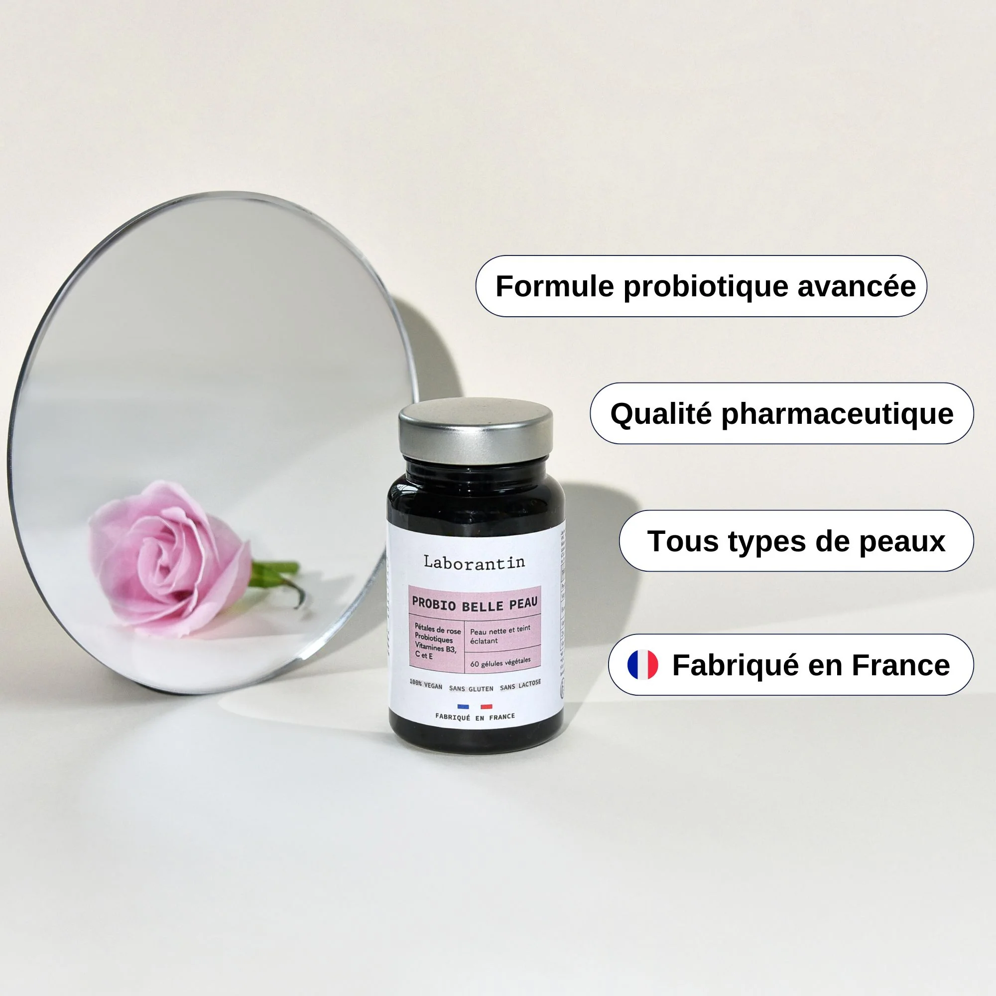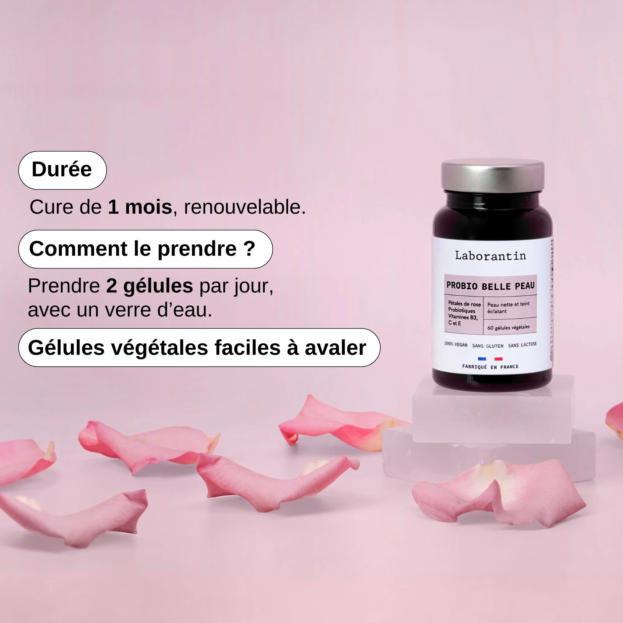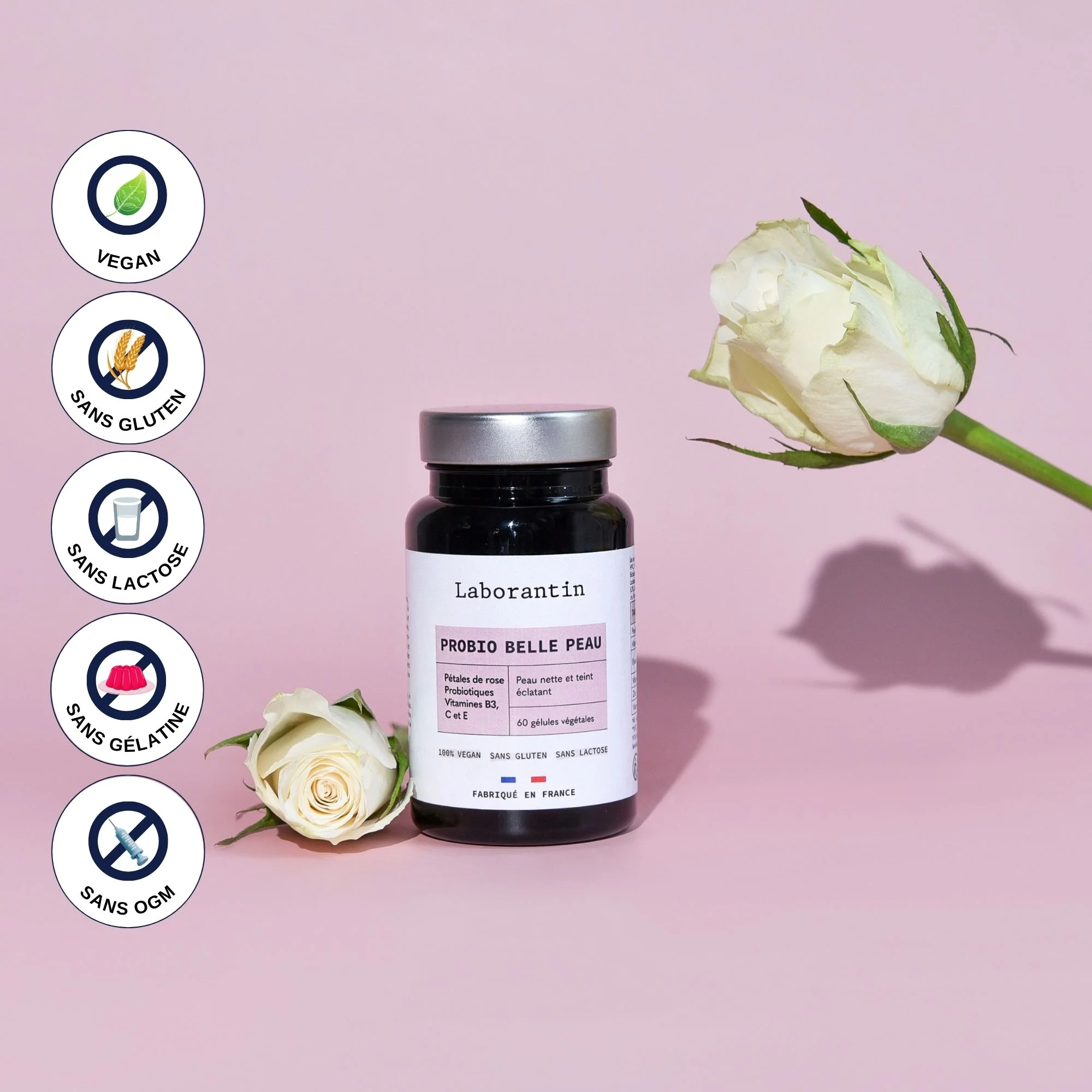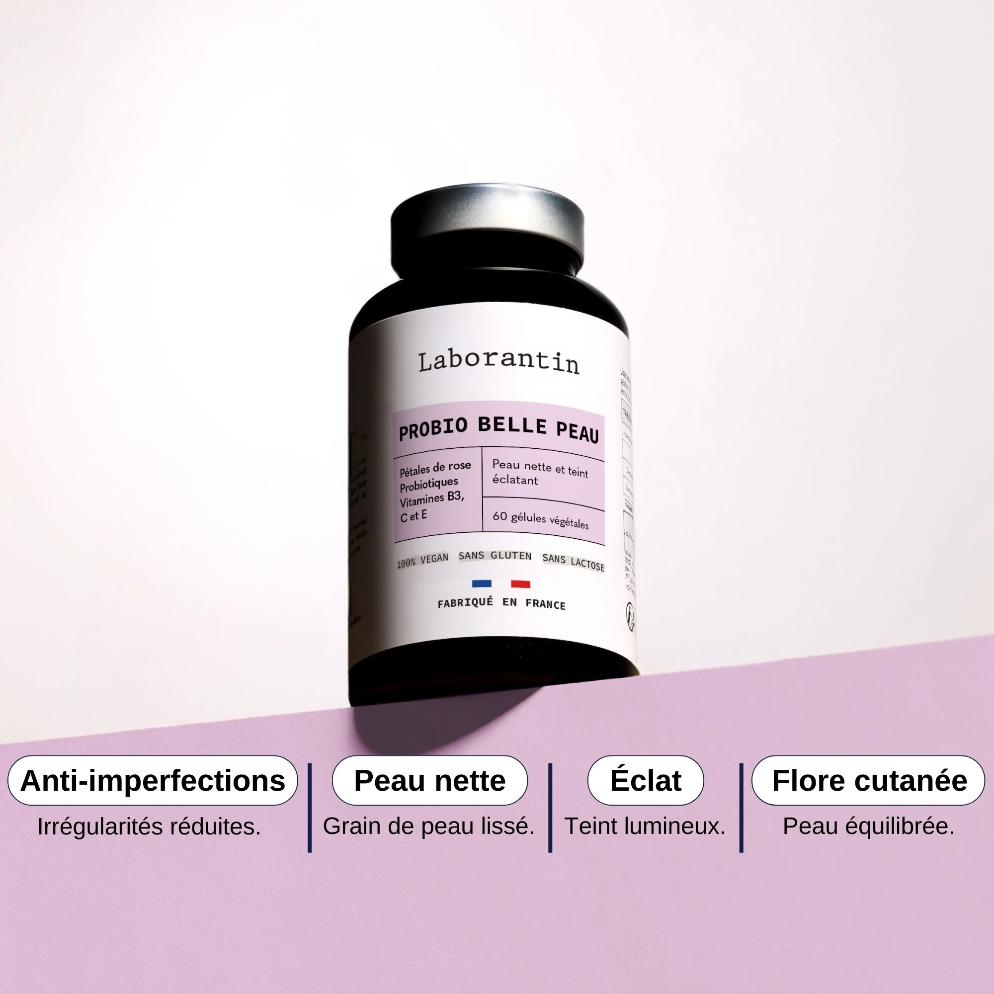 Hautement enrichi en probiotiques, pétales de rose et vitamines, Probio Belle Peau sublime la peau de l’intérieur. Ce complément alimentaire agit en profondeur pour réguler la flore cutanée et rééquilibrer l’épiderme. Sa formule naturelle cible efficacement les imperfections pour une peau nette et harmonieuse ainsi qu’un teint lumineux et éclatant.