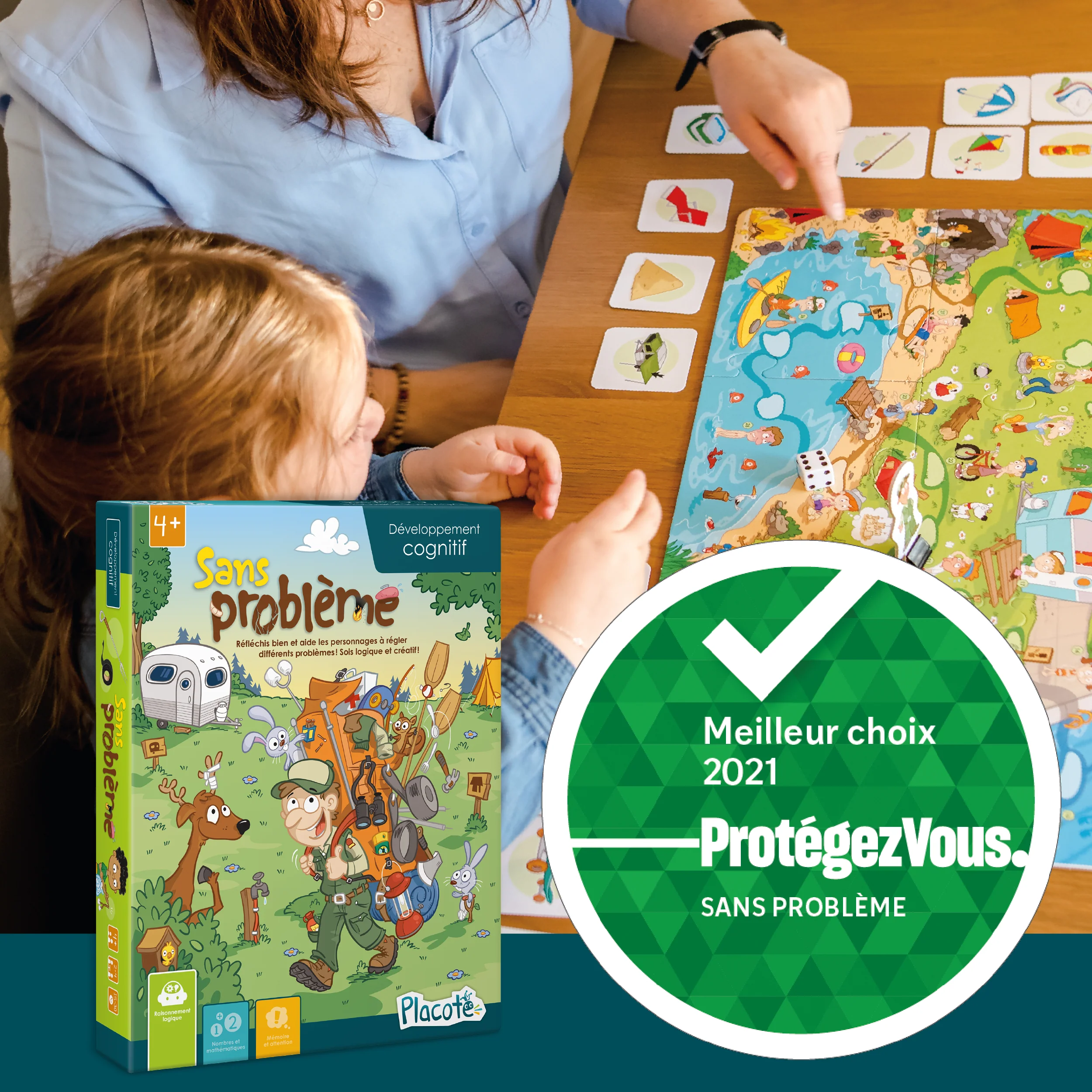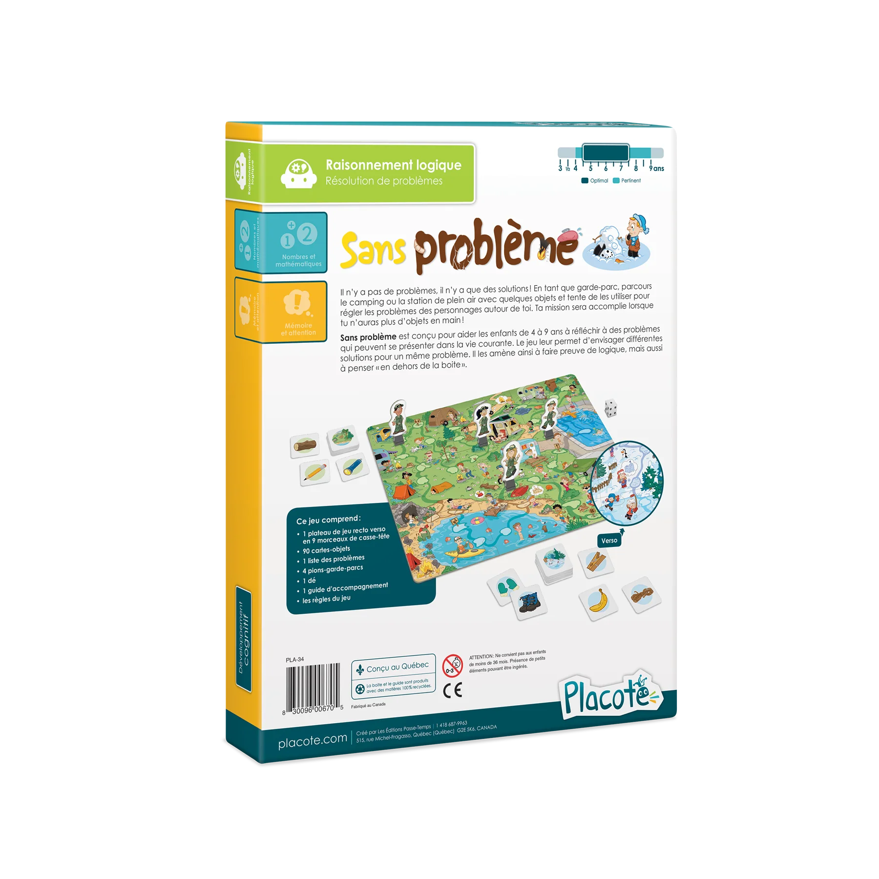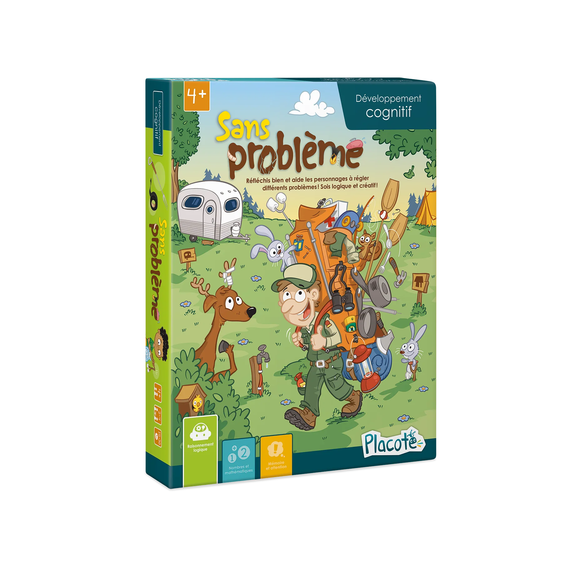 Sans problème est conçu pour aider les enfants de 4 à 9 ans à réfléchir à des problèmes qui peuvent se présenter dans la vie courante. Le jeu leur permet d’envisager différentes solutions pour un même problème. Il les amène ainsi à faire preuve de logique, mais aussi à penser «en dehors de la boite».
