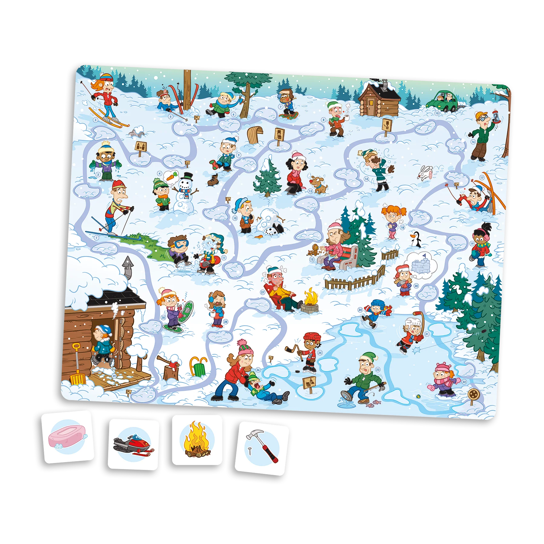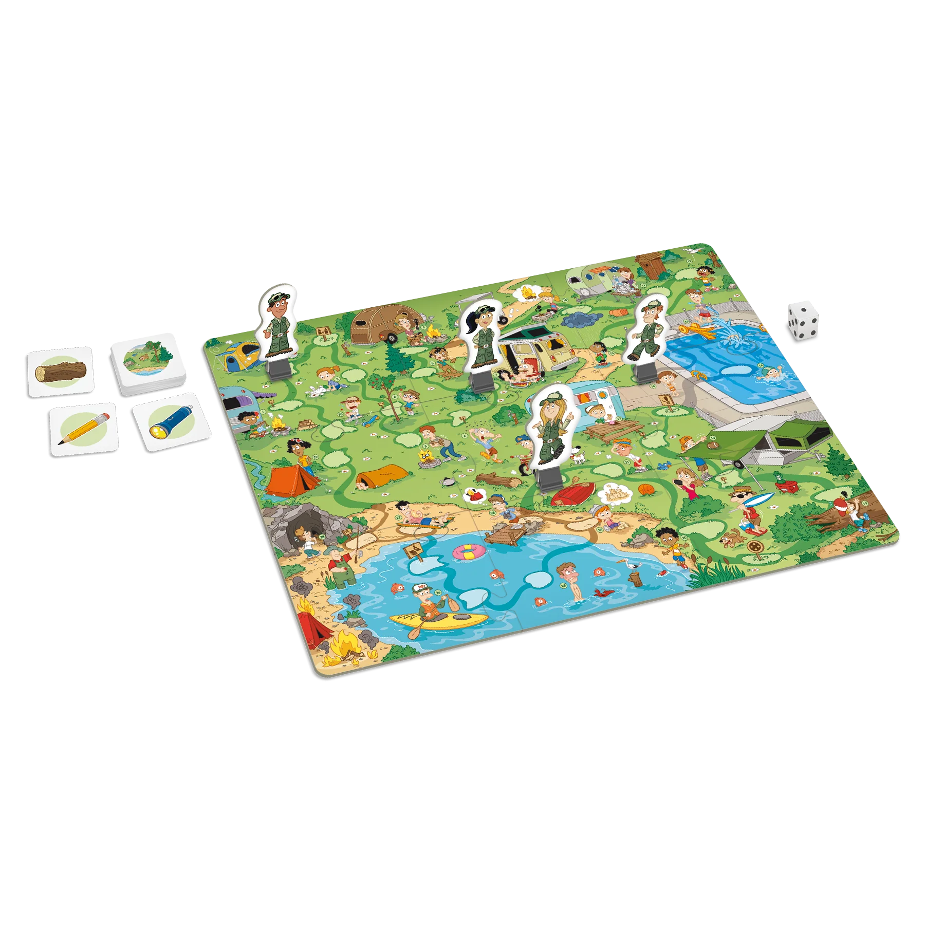 Sans problème comprend un plateau de jeu sur lequel sont illustrées une scène de camping en été d’un côté et une scène de base de plein air en hiver de l’autre côté. Chaque scène présente 30 problèmes courants (p. ex., tomber en ski ou avoir un pneu de vélo dégonflé). Les joueurs ont chacun un pion qu’ils avancent après avoir lancé le dé et des cartes-objets qui leur servent à régler les problèmes (p. ex., de l’eau dans un seau peut éteindre un feu). Ainsi, un joueur dont le pion arrive sur une case représentant un problème donné doit chercher dans ses cartes un objet qui peut résoudre ce problème. Le but du jeu est d’être le premier à se débarrasser de toutes ses cartes. Les cases spéciales complexifient le jeu en demandant d’effectuer des changements de cartes-objets.