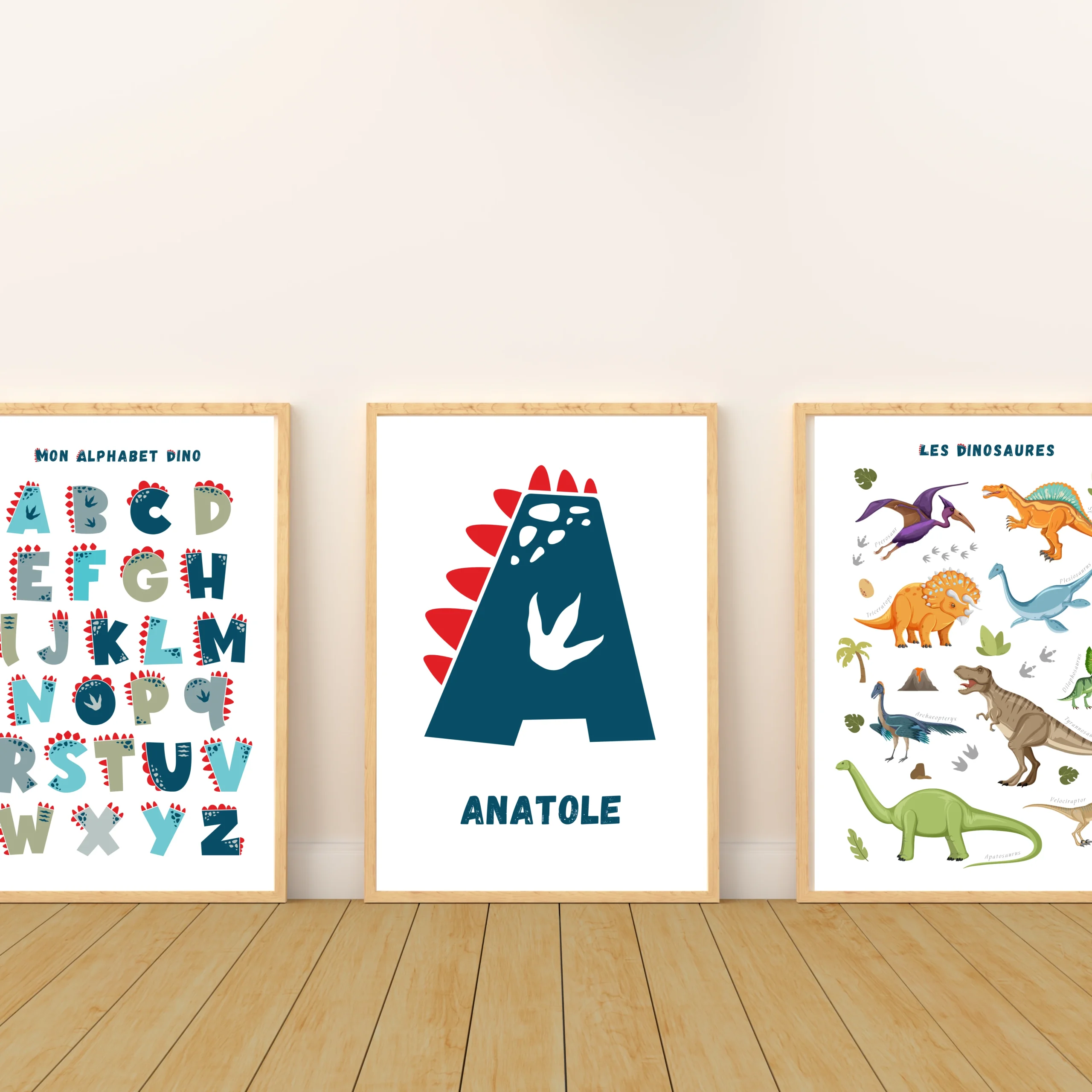 ❤️ Voici un set de 3 affiches pour enfant sur le thème des dinosaures. Parfait pour un fan de dinosaure et pour décorer la chambre d’un petit garçon. Une des affiches est personnalisée avec le prénom de l’enfant.
