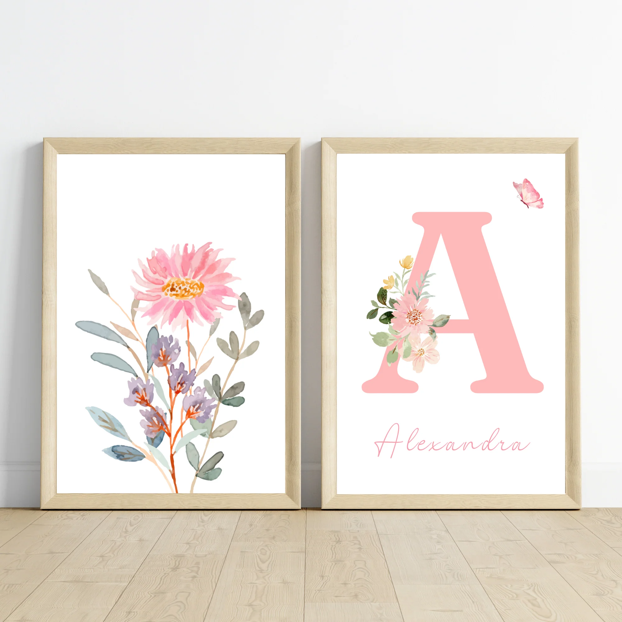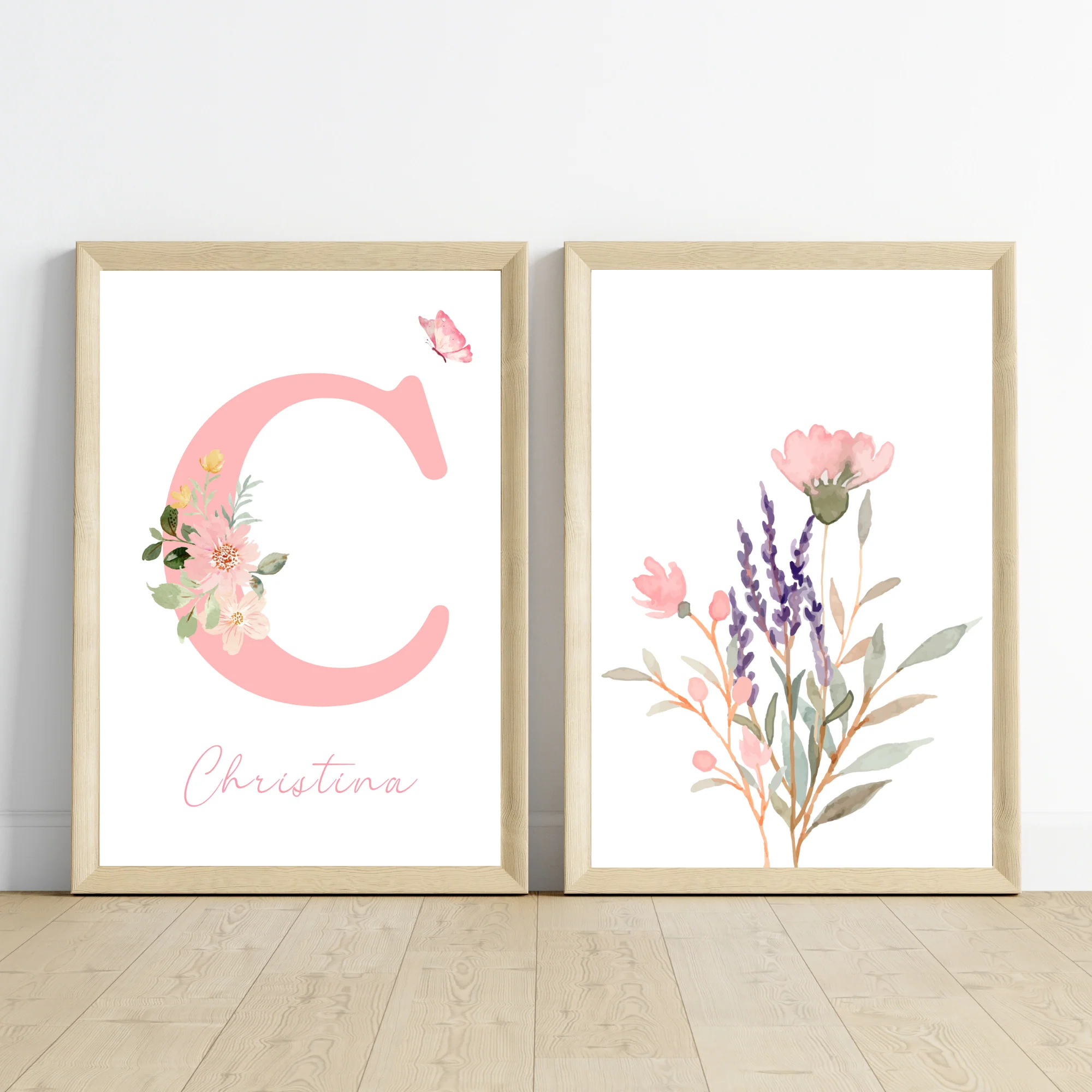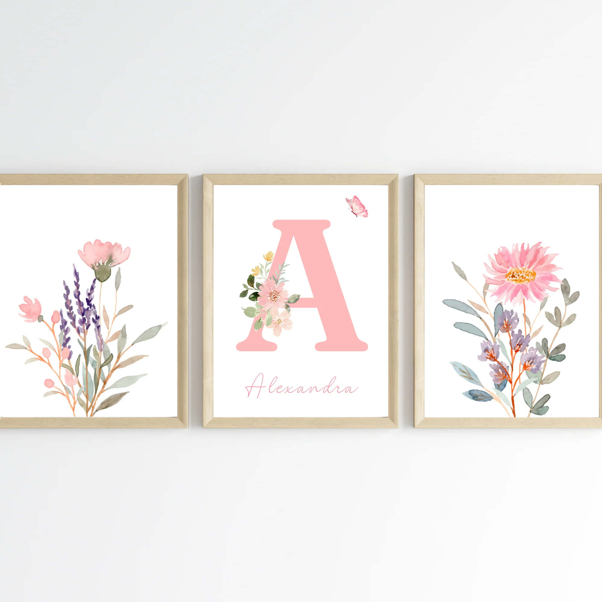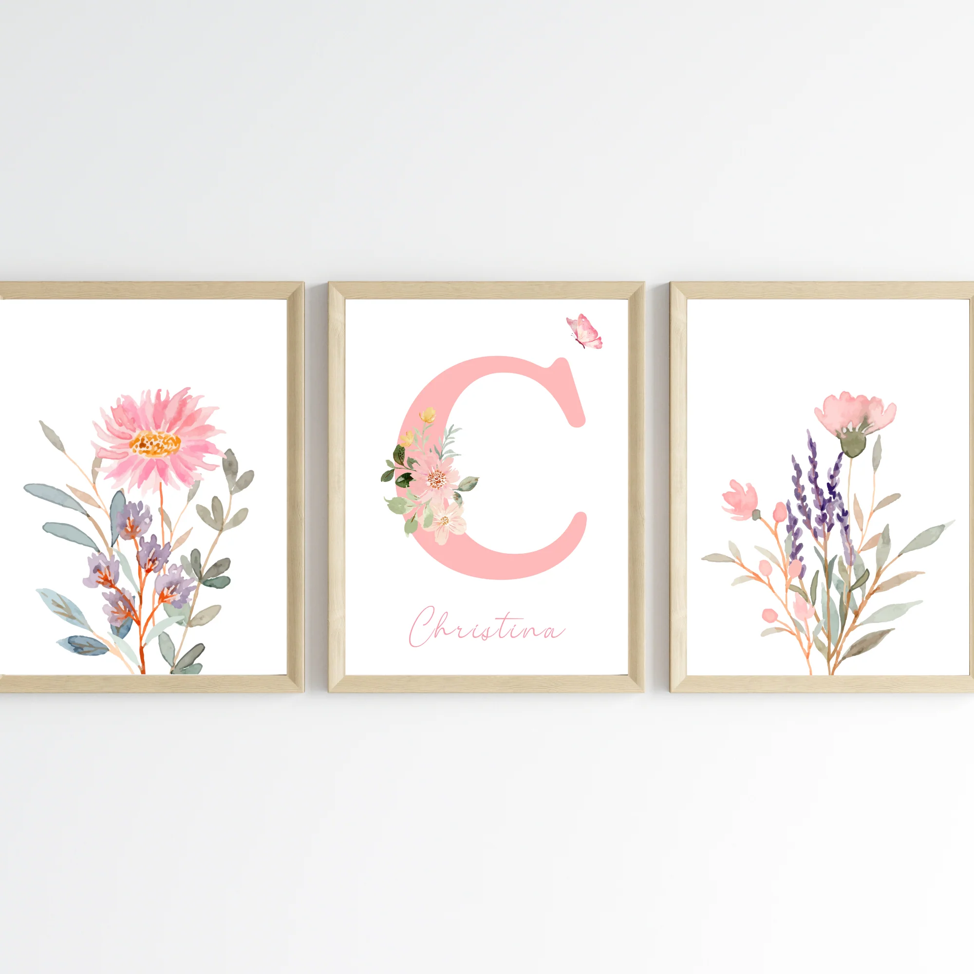 Set de 3 affiches fleurs chambre d’enfant – Décoration fille avec prénom – Initiale et bouquet de fleurs par Le Temps des Paillettes