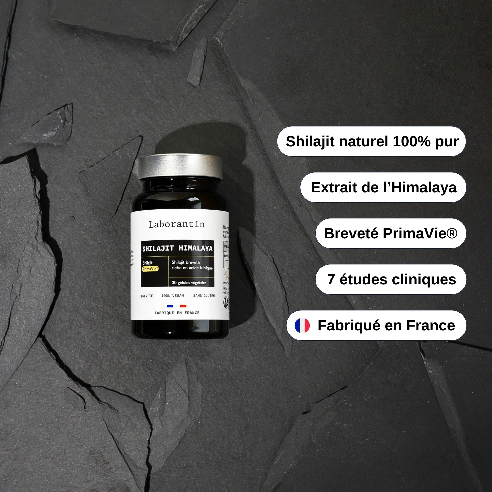 Shilajit Himalaya, formulé avec le shilajit breveté PrimaVie®, est reconnu pour sa qualité exceptionnelle et sa richesse en acides fulvique et humique ainsi qu’en minéraux essentiels. Récolté au cœur des montagnes de l’Himalaya, ce shilajit 100 % pur, appuyé par 7 études cliniques, est un allié naturel pour soutenir l’énergie et la vitalité. Grâce à son excellente biodisponibilité, il aide à optimiser la concentration, à renforcer les défenses naturelles et à favoriser une récupération musculaire optimale, tout en contribuant à maintenir de bonnes performances physiques et une endurance durable.