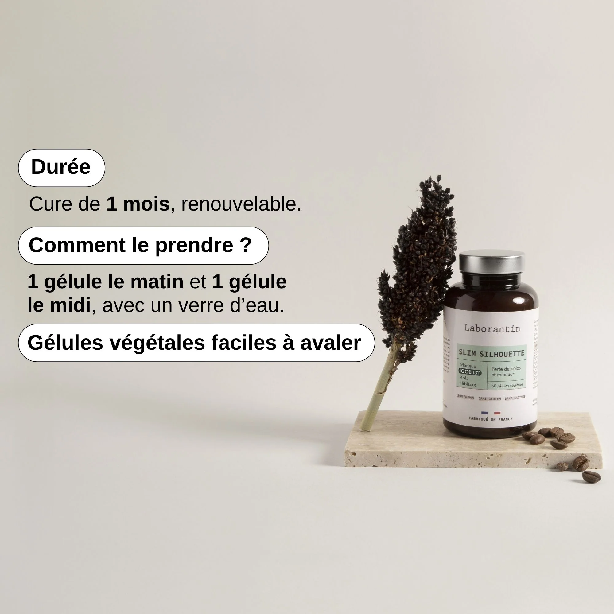 | Durée de la cure | 1 mois | 60 gélules | -12%, 2 mois – RECOMMANDÉ | 120 gélules | -15%, 3 mois | 180 gélules | -18% |