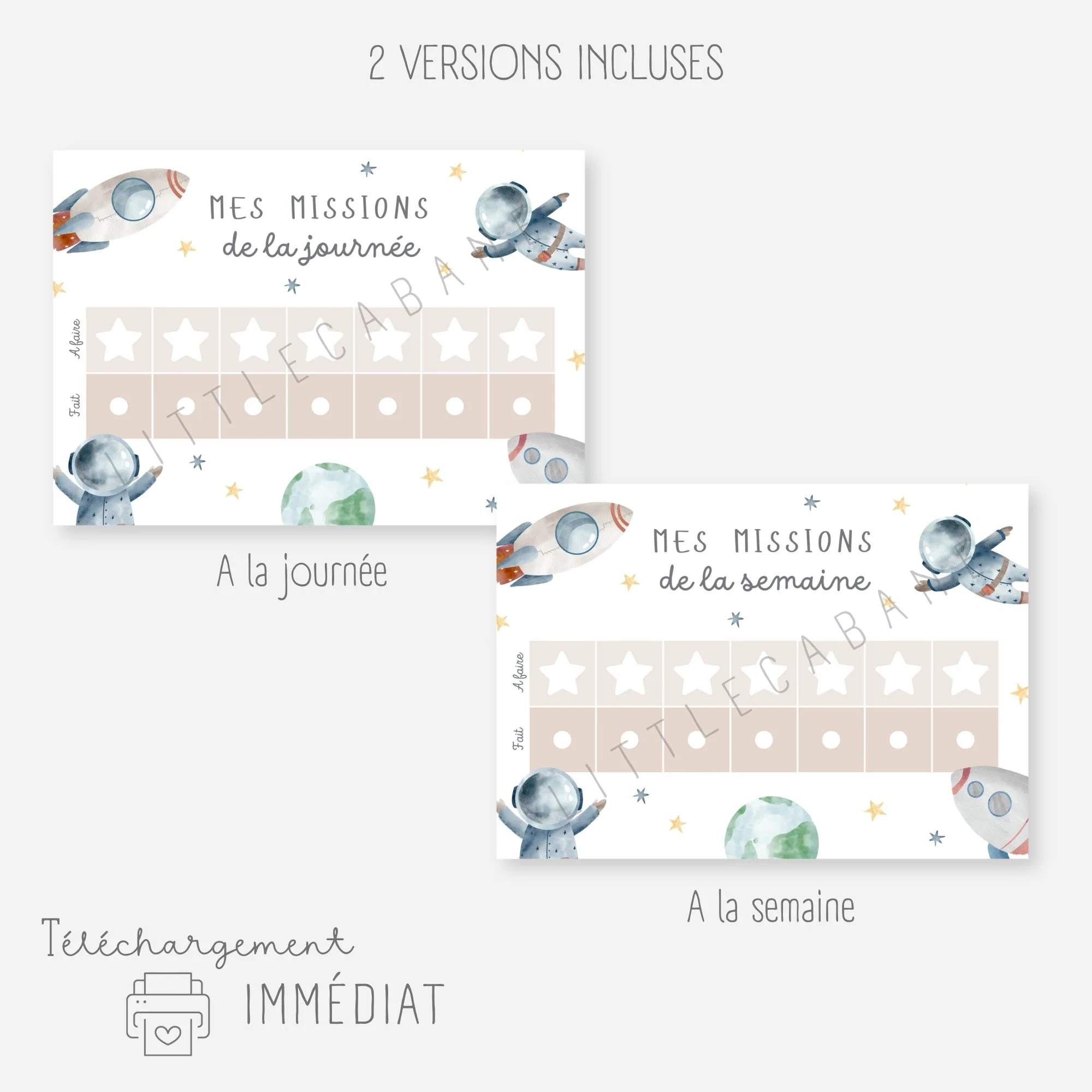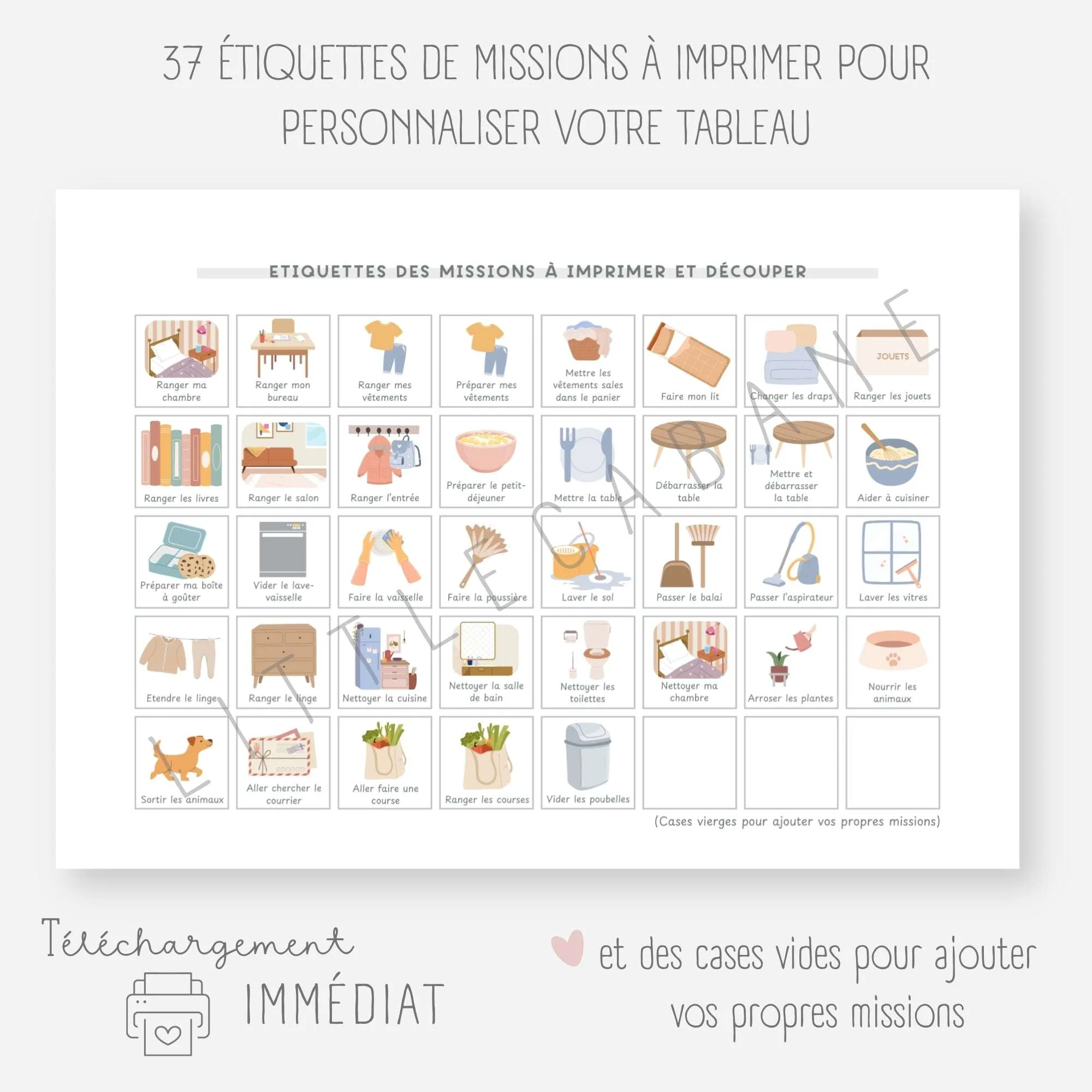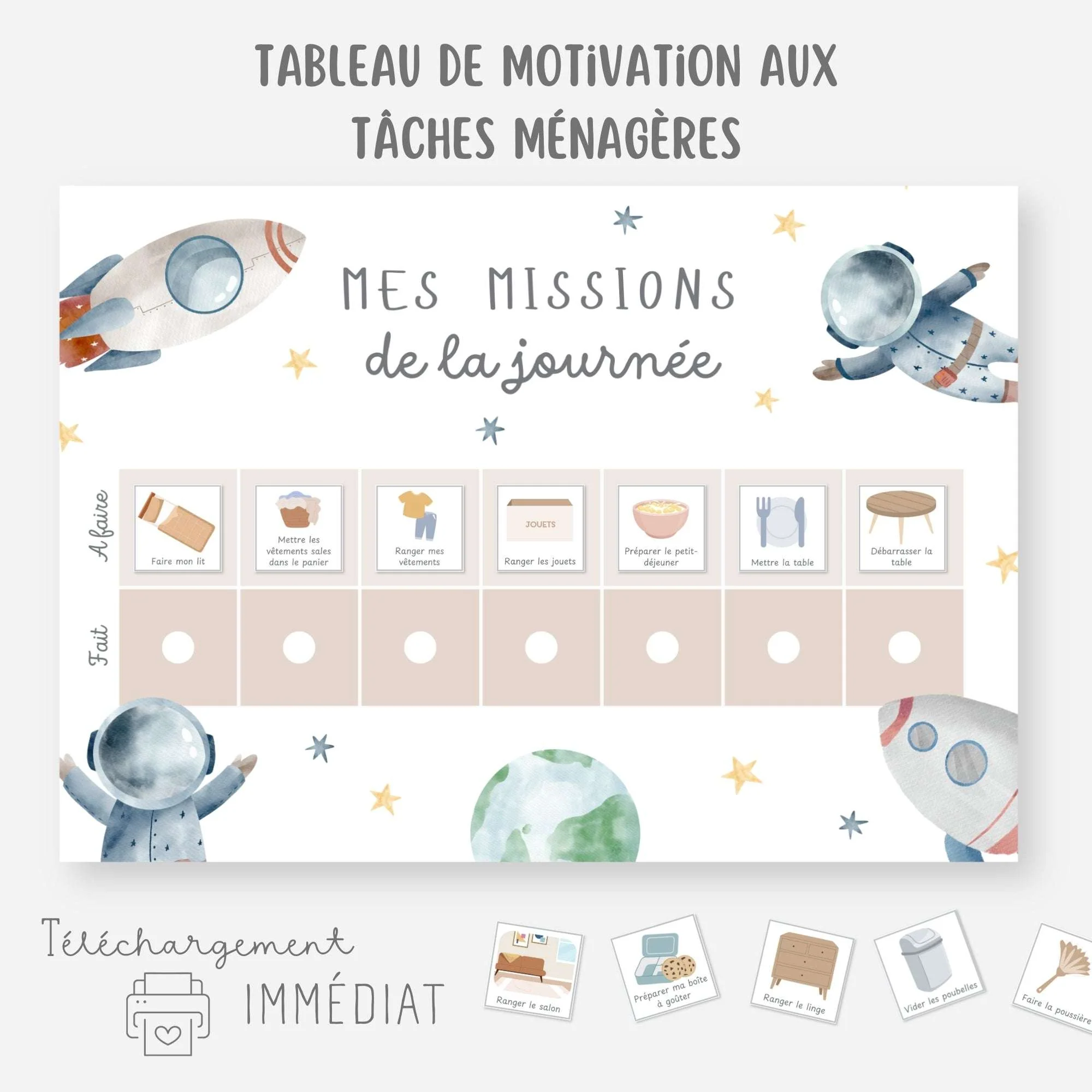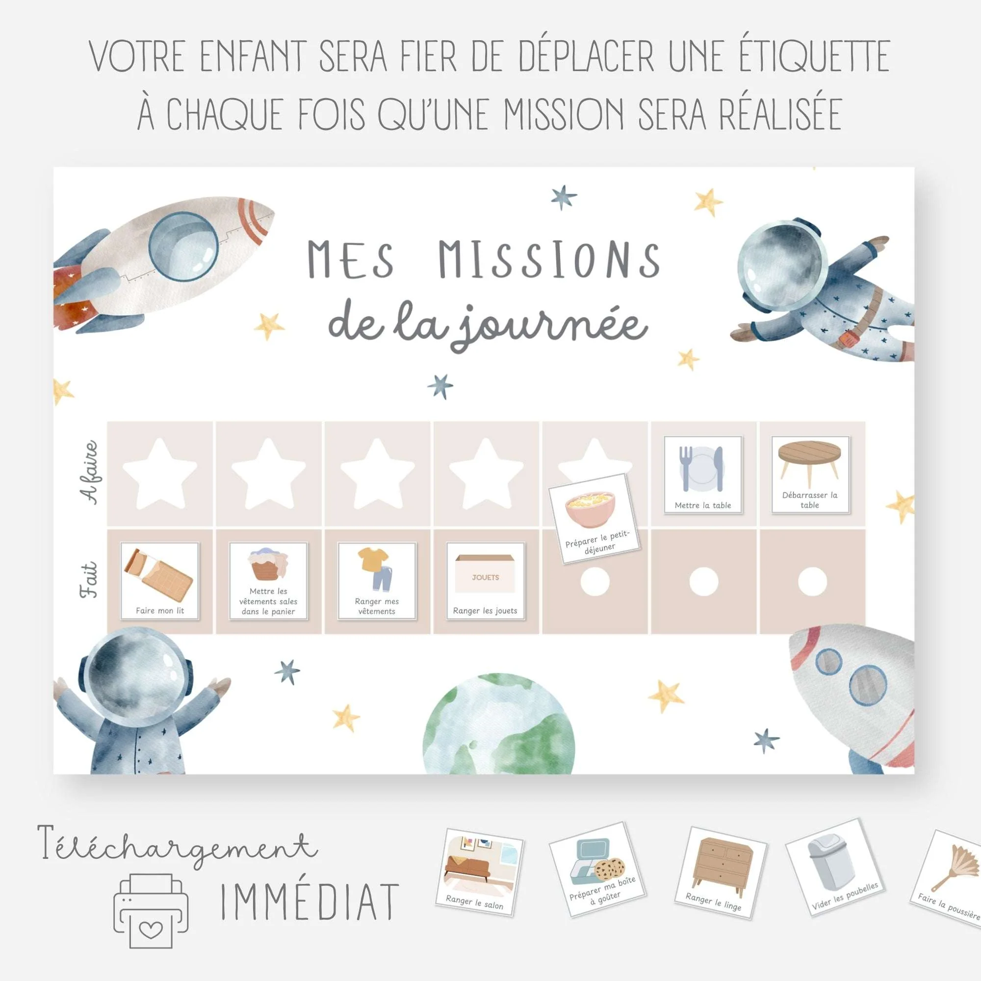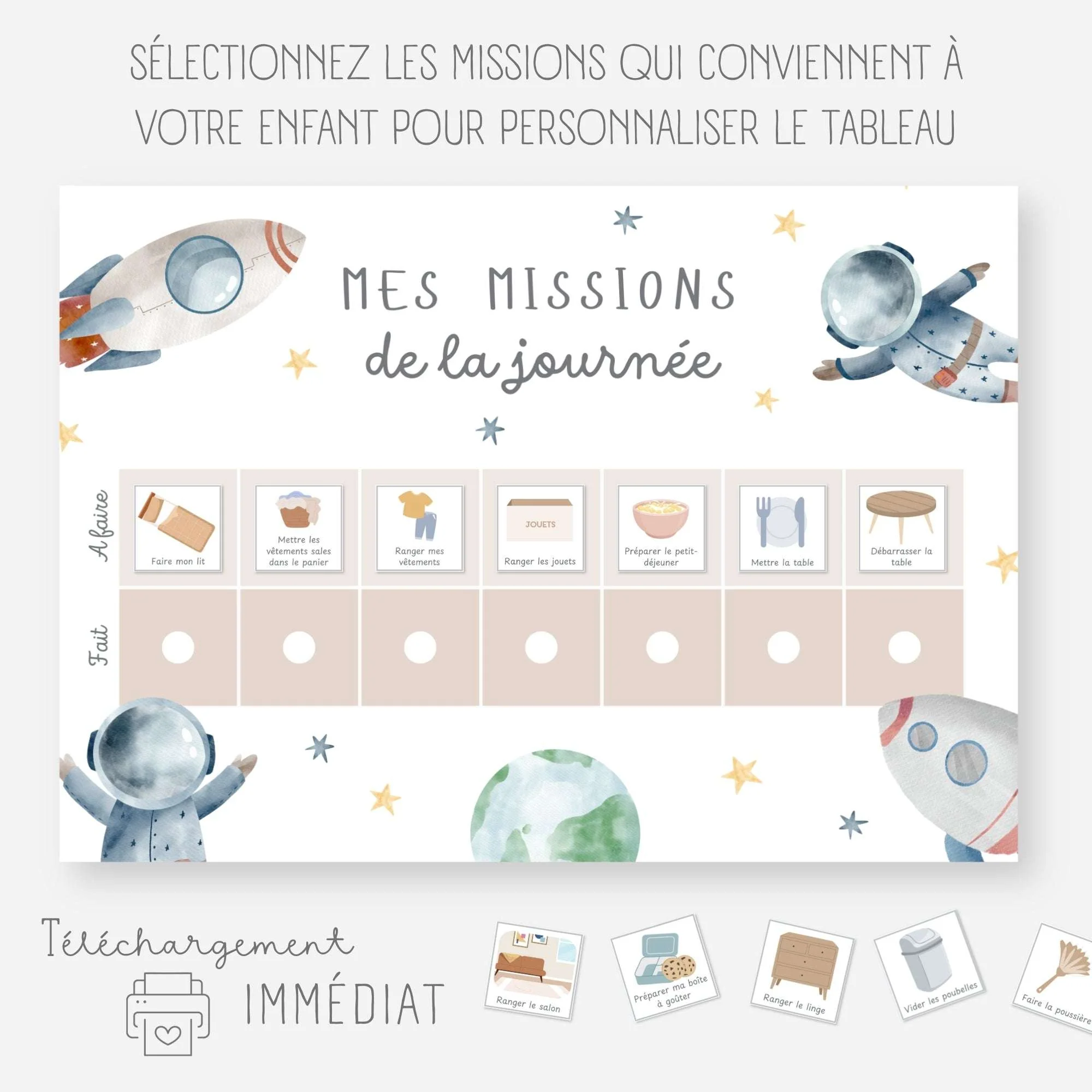 Sélectionnez les tâches à accomplir parmi les vignettes et positionnez-les sur le tableau. À chaque fois que votre enfant aura effectué une mission, il la déplacera sur le tableau et sera fier de lui !
