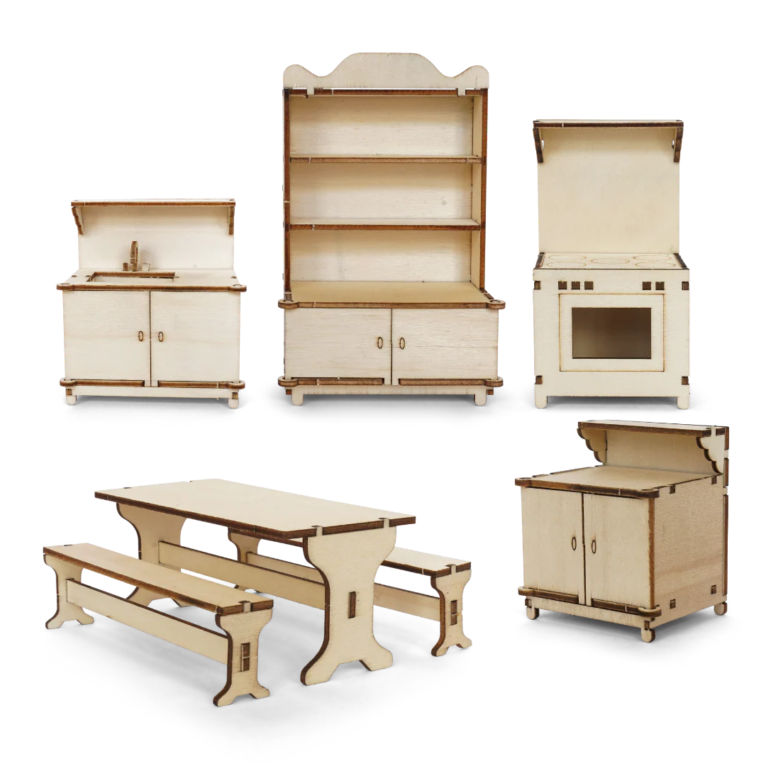 Suitable from 6 years and up | Scale: 1:12 | Kitchen set materials: Carton, Wood, CE certified | Plush doll size: 13 cm, Materials: Polyester & Cotton, Hand wash and air dry