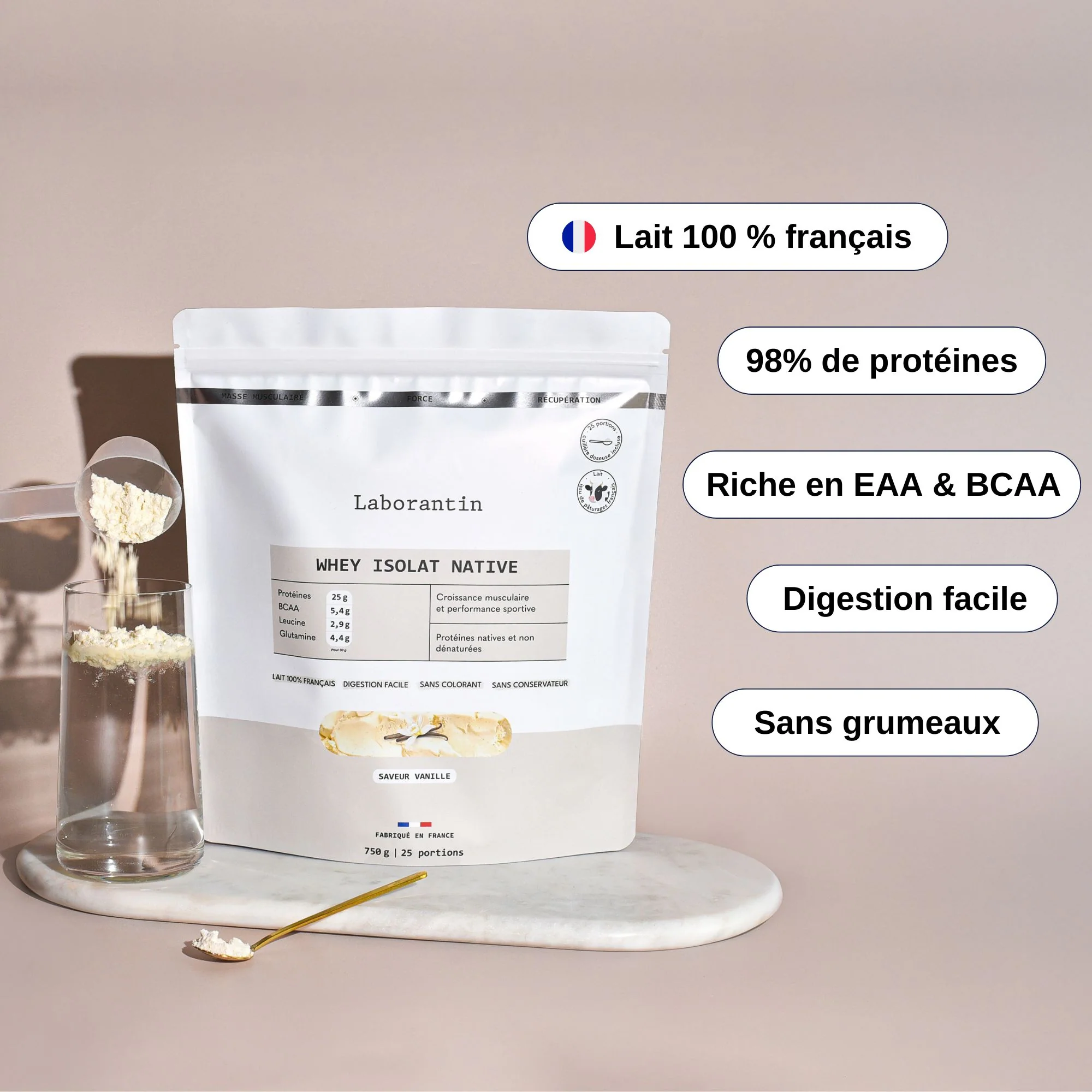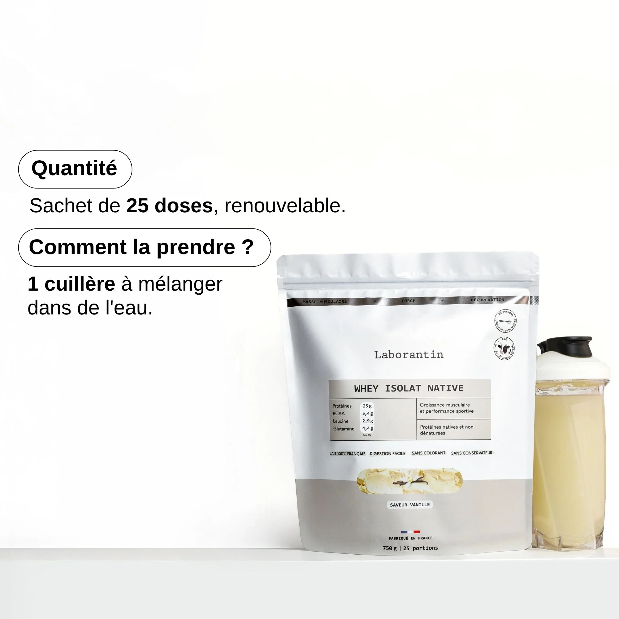 Issue de lait français et dosée à 98% de protéines, notre Whey Isolat Native allie pureté maximale, performance sportive et goût vanille intense.