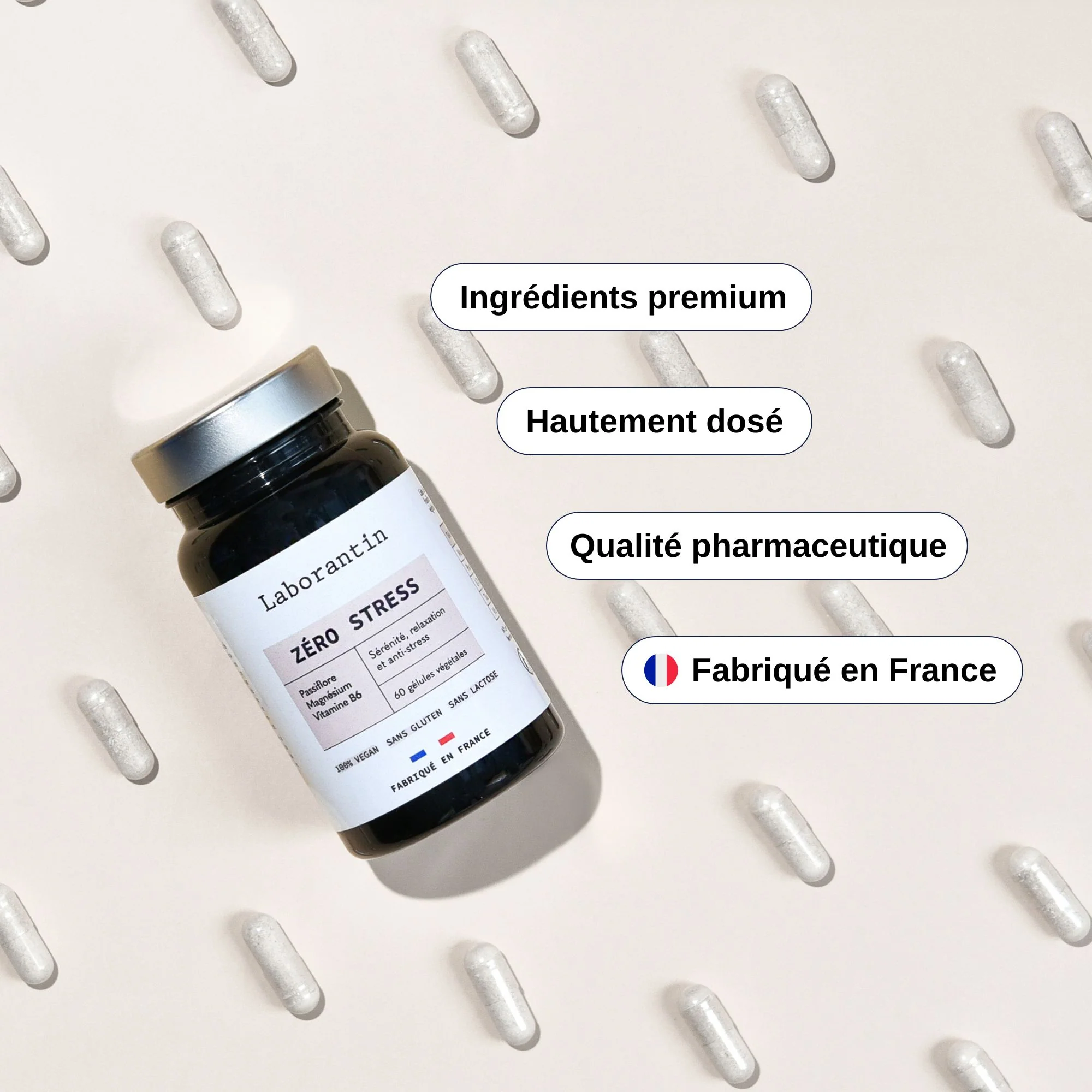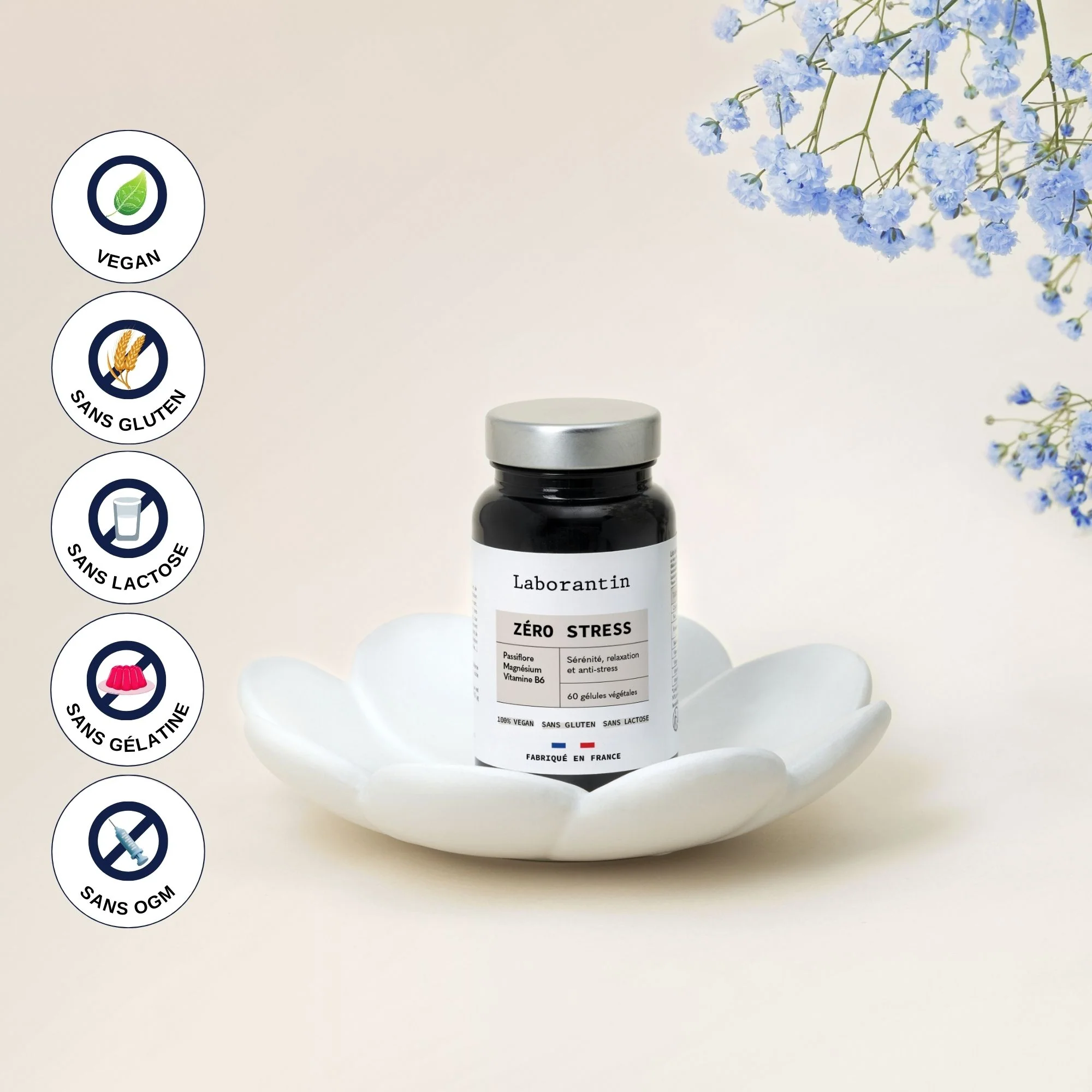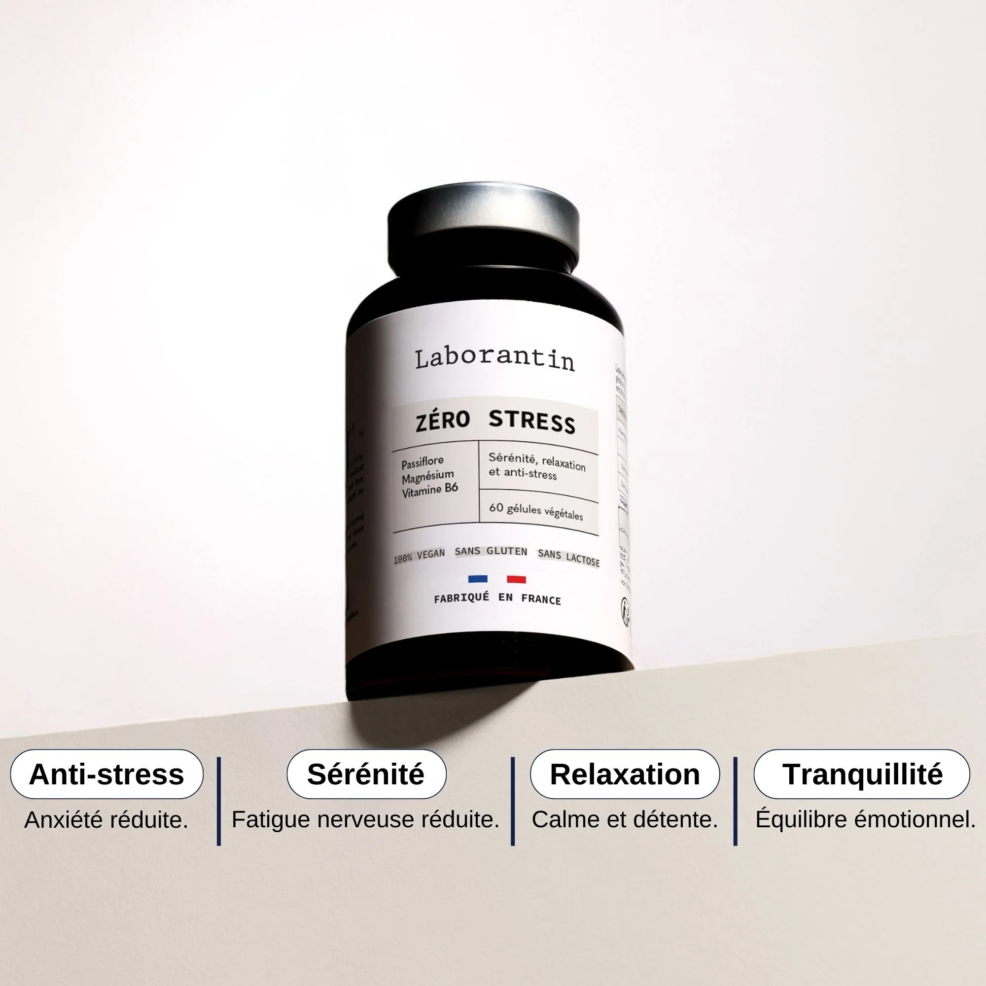 Conçu pour lutter contre le stress, Zéro Stress favorise le calme et la sérénité. Enrichi en passiflore, magnésium, L-Tryptophane, taurine et vitamine B6, cette formule unique apaise les symptômes de dépression et d’anxiété. Cette combinaison d’ingrédients naturels aide à réduire le taux de cortisol et à retrouver la tranquillité d’esprit pour un bien-être au quotidien.
