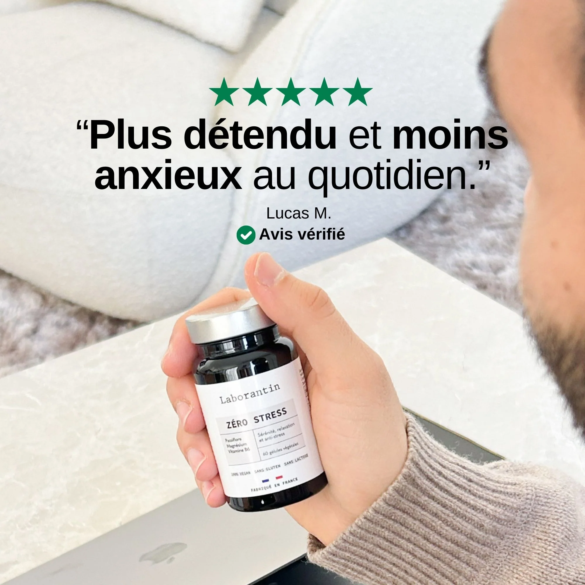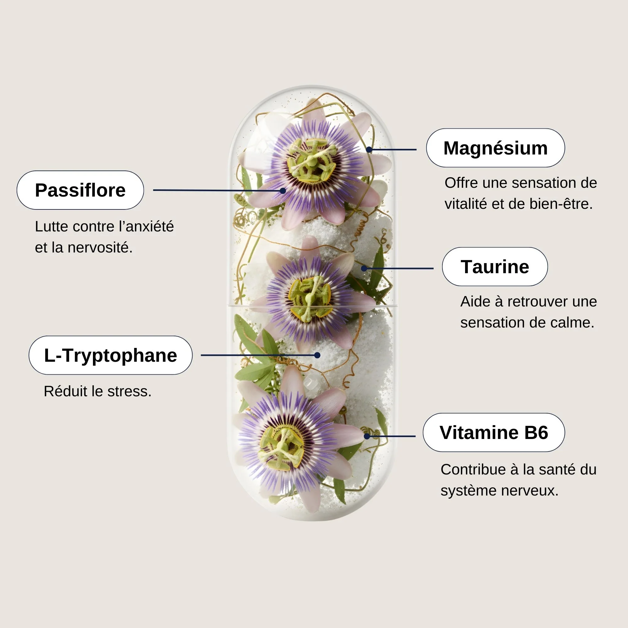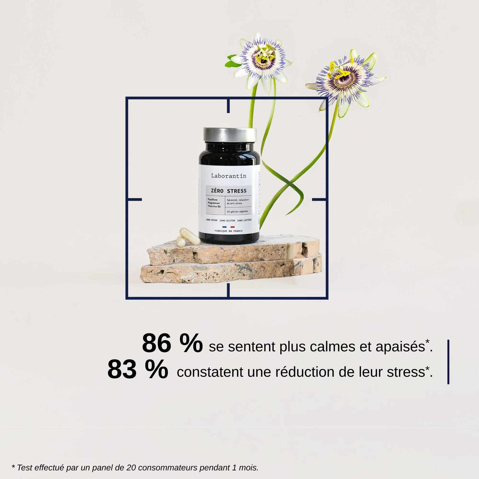 Conçu pour lutter contre le stress, Zéro Stress favorise le calme et la sérénité. Enrichi en passiflore, magnésium, L-Tryptophane, taurine et vitamine B6, cette formule unique apaise les symptômes de dépression et d’anxiété. Cette combinaison d’ingrédients naturels aide à réduire le taux de cortisol et à retrouver la tranquillité d’esprit pour un bien-être au quotidien.