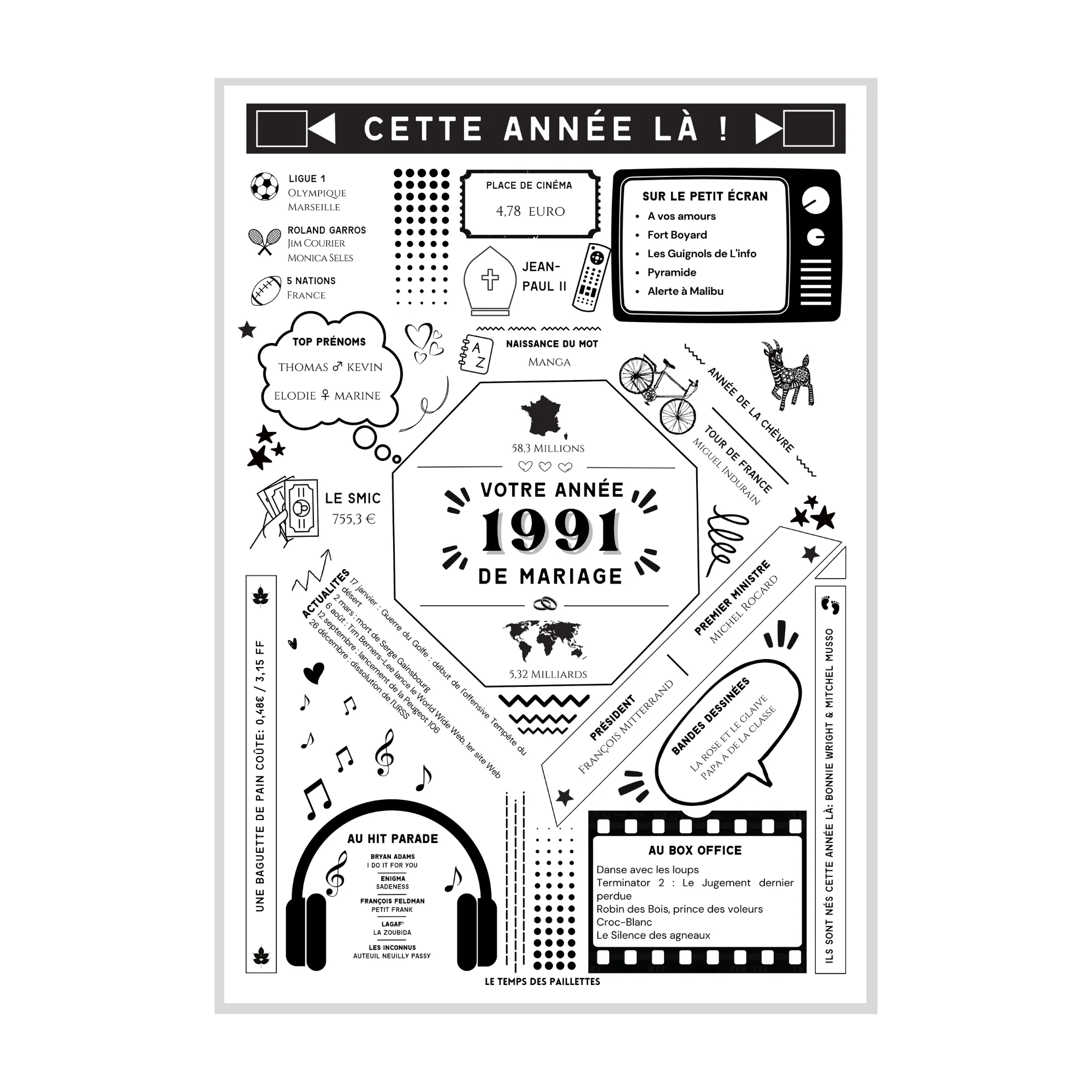 Voici la collection « Affiche votre année de mariage ». Offrez à un couple de mariés une affiche unique et personnalisée pour commémorer leur journée spéciale ! Notre affiche de noces de mariage est disponible pour chaque année de mariage et est personnalisée avec des faits marquants de cette année-là . Par exemple: vous trouverez le coût d’une baguette, d’une place de cinéma ou le SMIC, les musiques au hit-parade, les films, les palmarès sportifs, les personnes célèbres nées cette année-là, et plus encore!