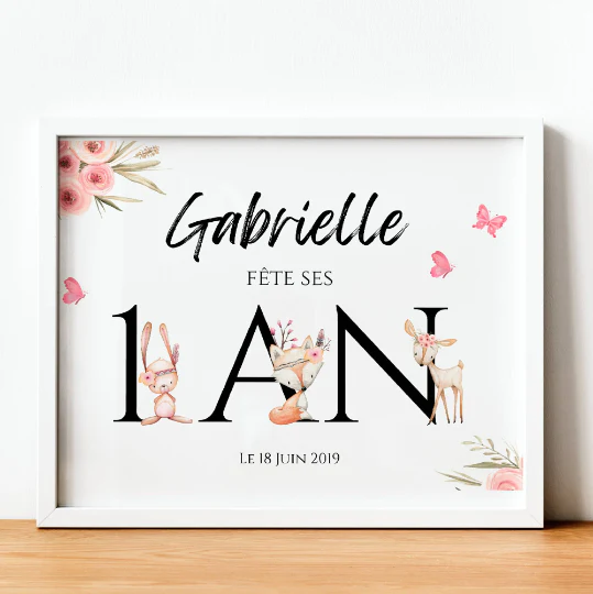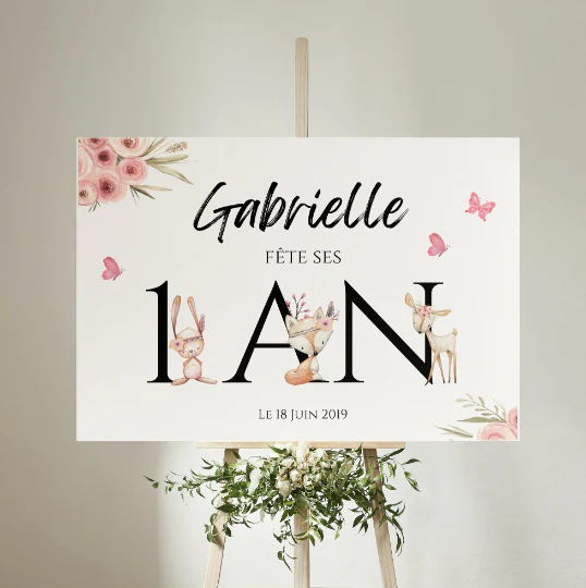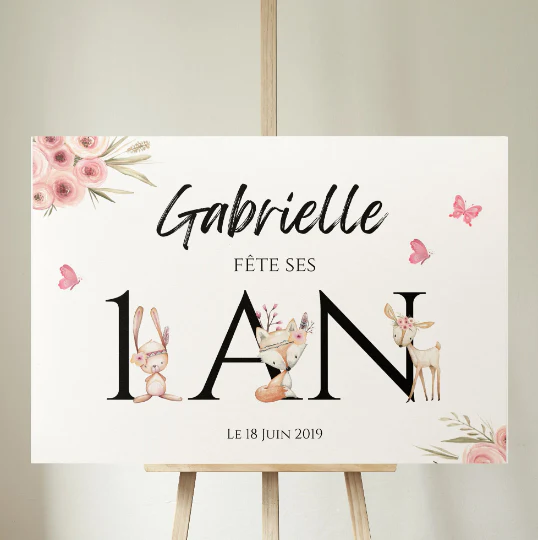 Jolie modèle d’affiche de bienvenue pour anniversaire d’enfant. Un panneau de bienvenue à personnaliser sur le thème des animaux de la foret dans des teintes roses, idéal pour une petite fille. Vous pouvez personnaliser le texte de l’affiche: