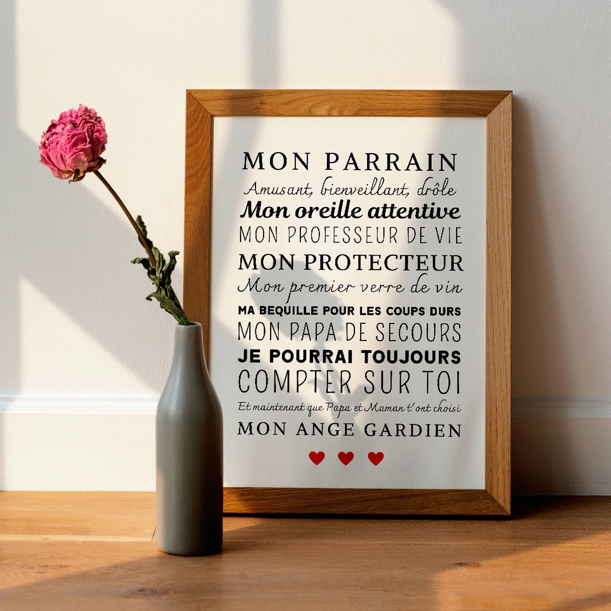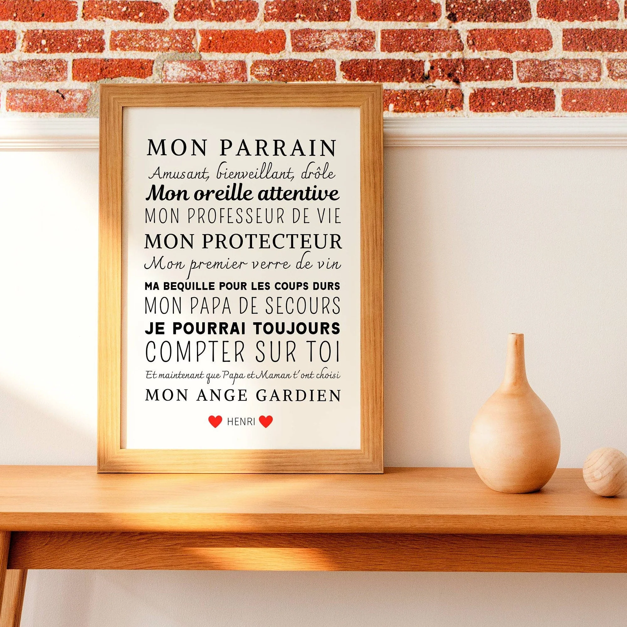 Cette affiche est idéale pour faire plaisir à tous les parrains en toute occasion : Noël, baptême, anniversaire, etc. C’est également une jolie façon de faire une demande pour devenir parrain !