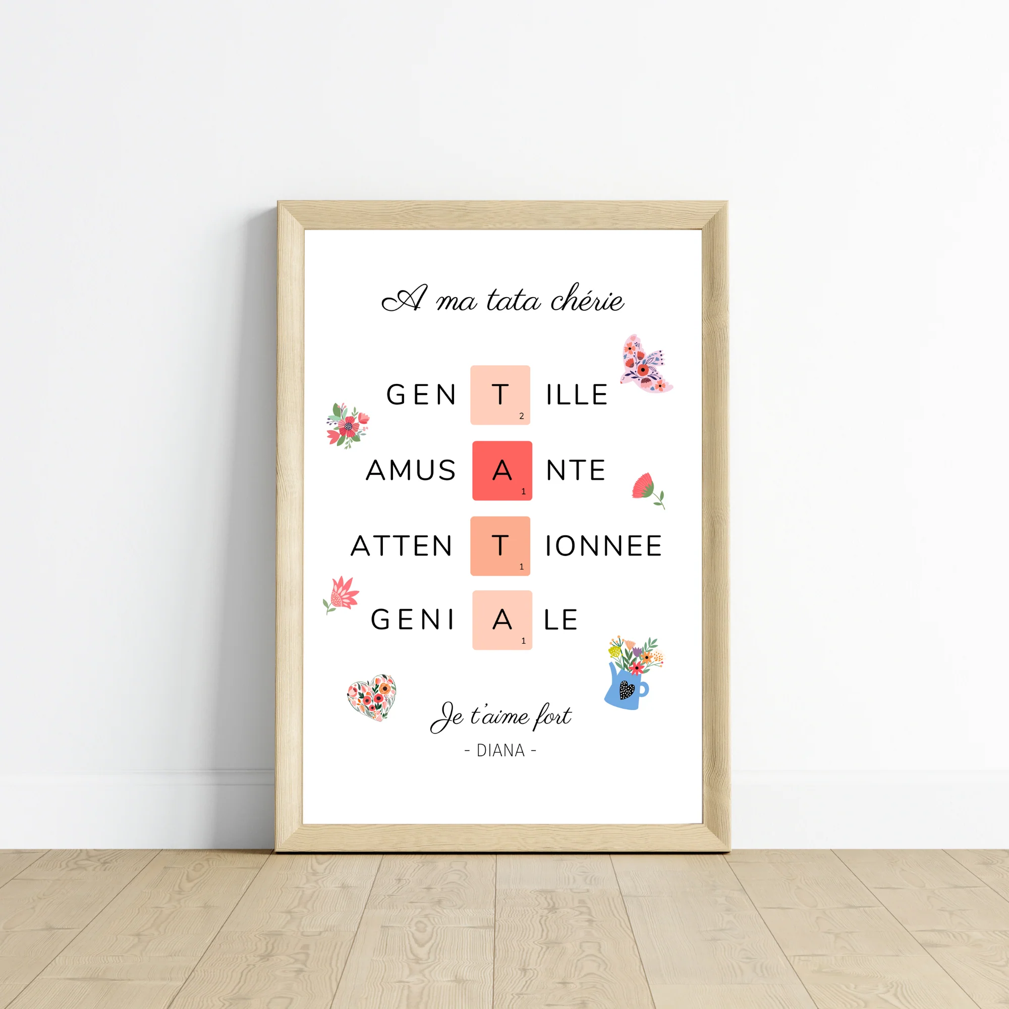 ❤️ ❤️ Jolie affiche pour la tata de vos enfants. Cette affiche est décorée avec le mot tata dans des lettres de scrabble. L’affiche peut être également personnalisée avec le prénom des neveux.