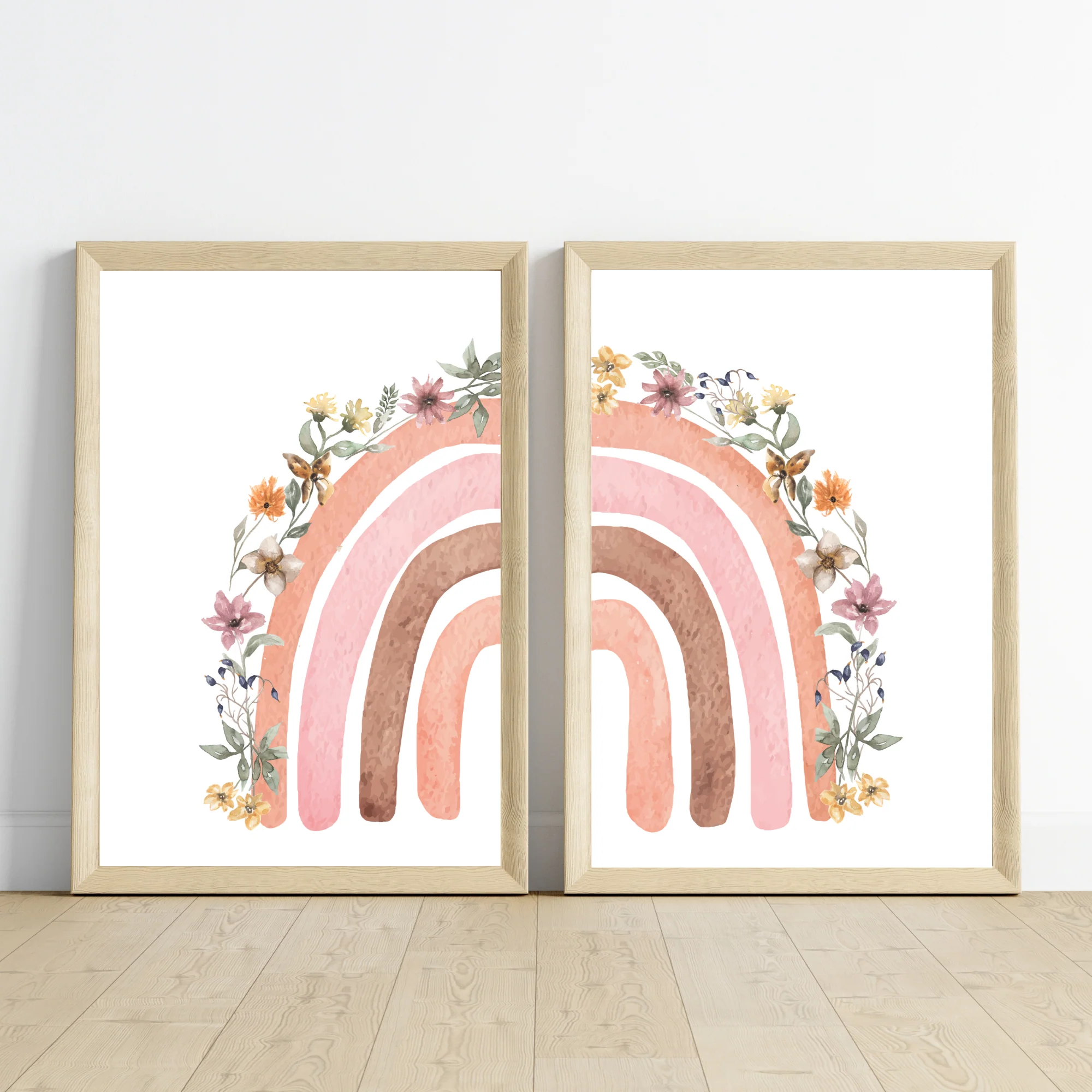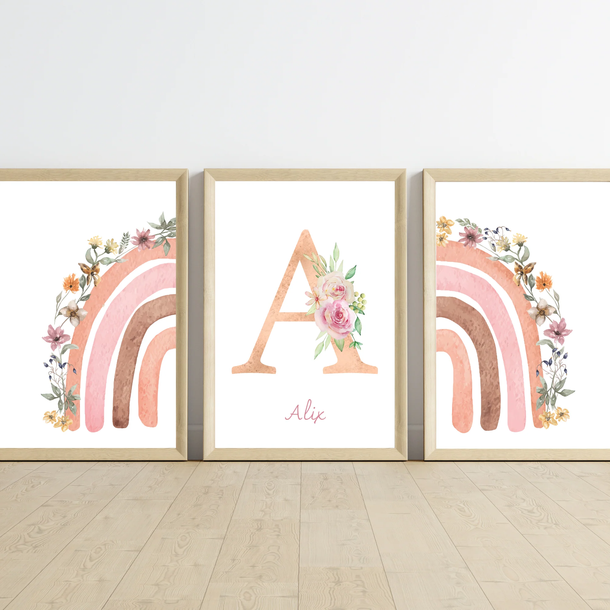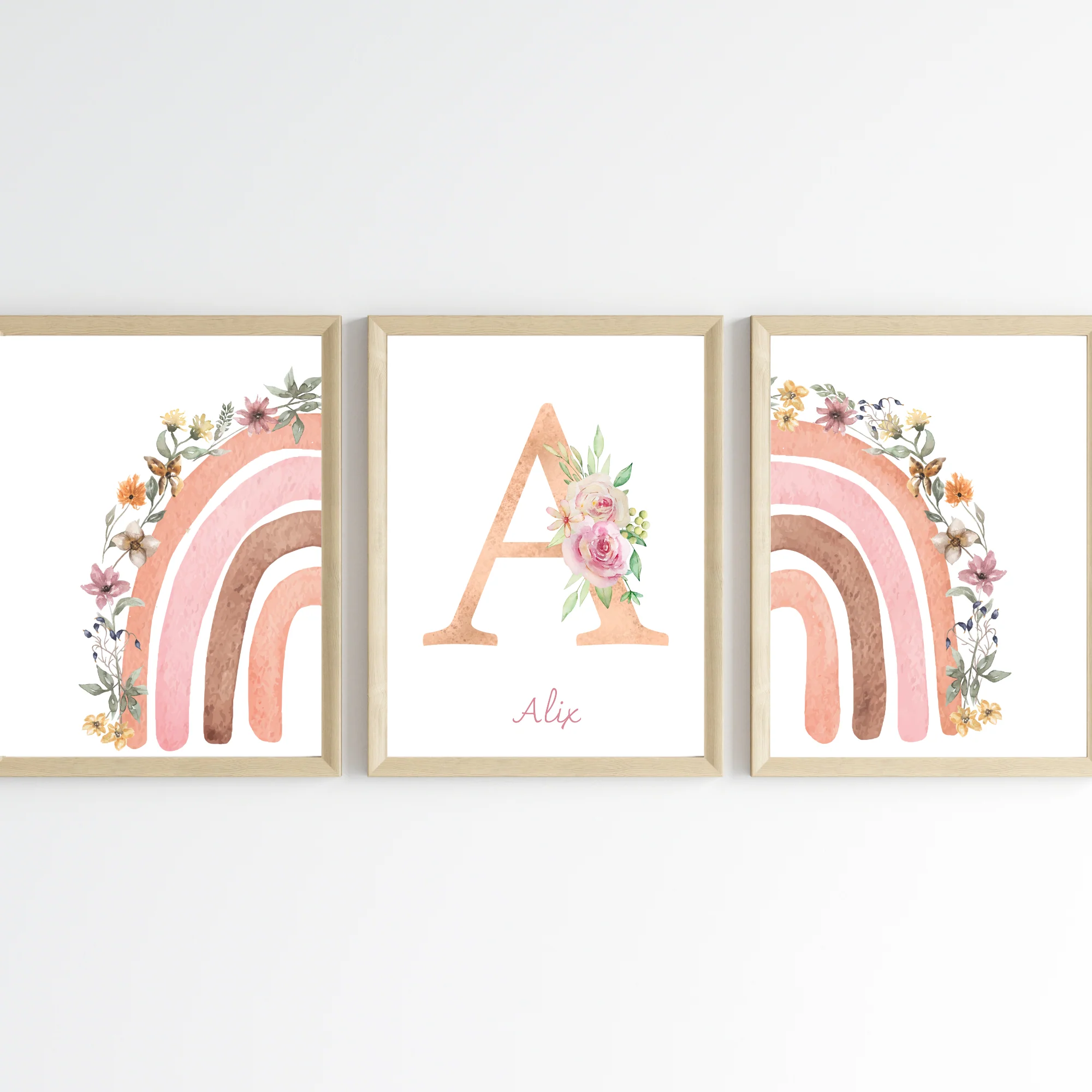 ❤️ Jolie set de 3 affiches pour enfant dans le style bohème décoré avec un arc en ciel fleuri et une affiche avec un monogramme fleur ainsi que le prénom de l’enfant.