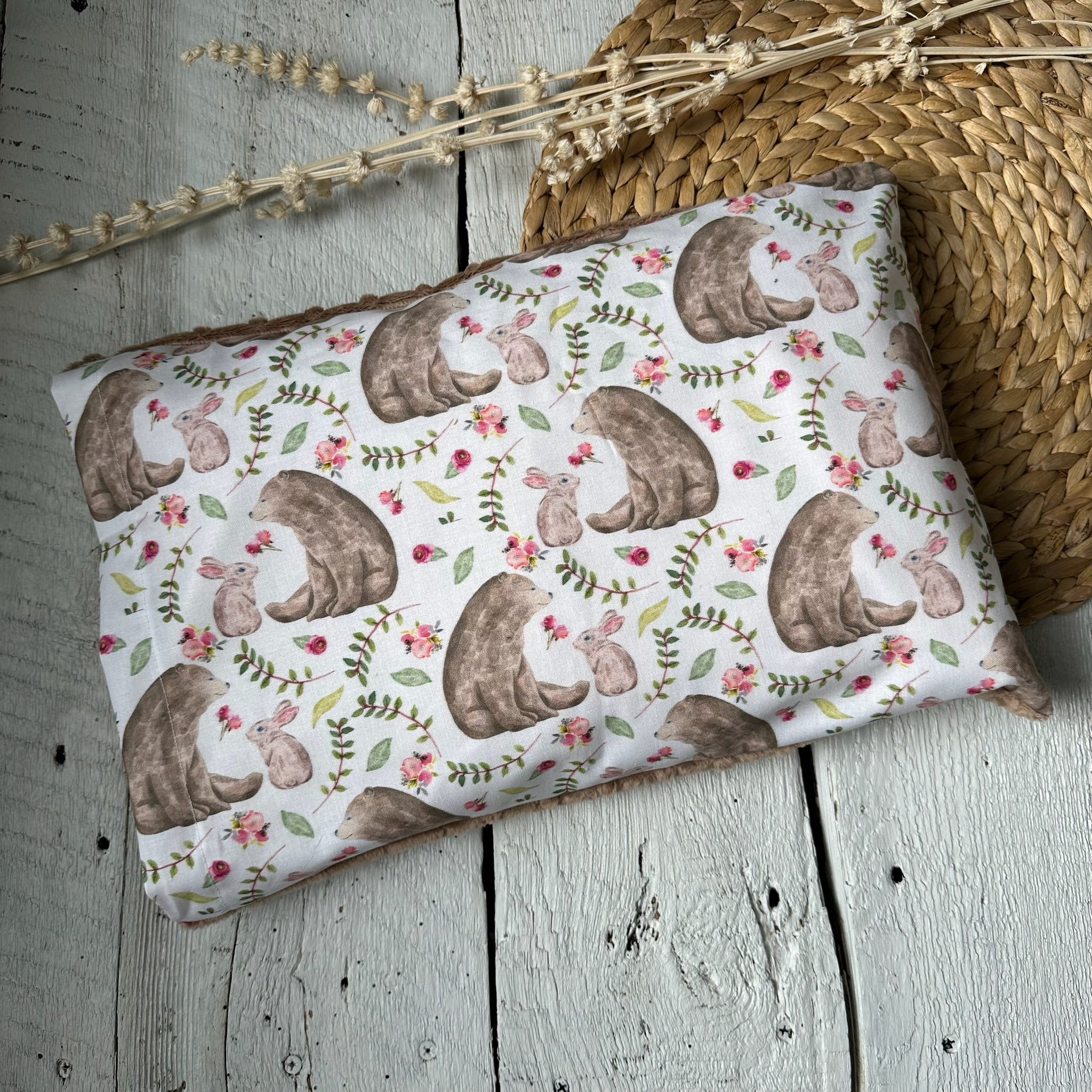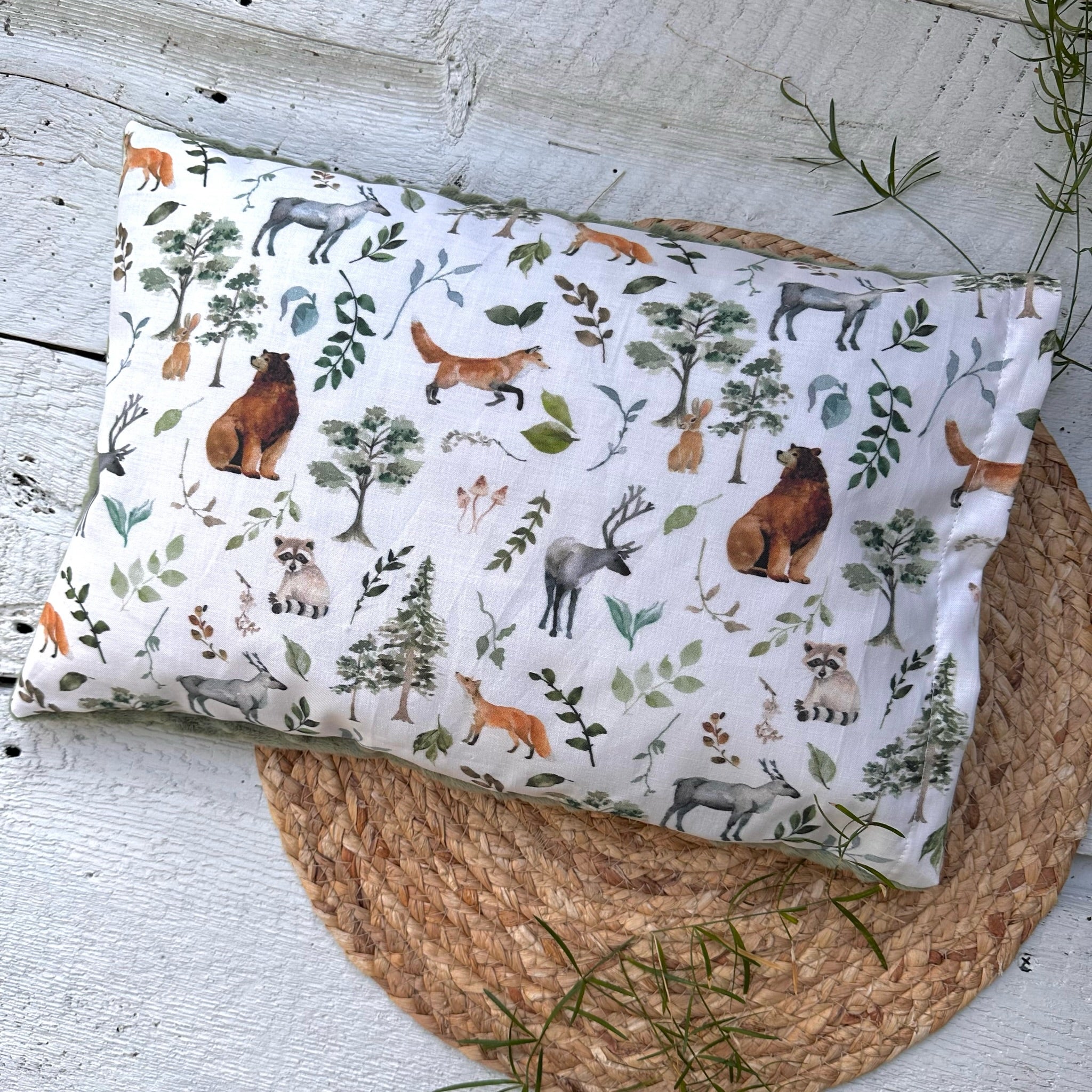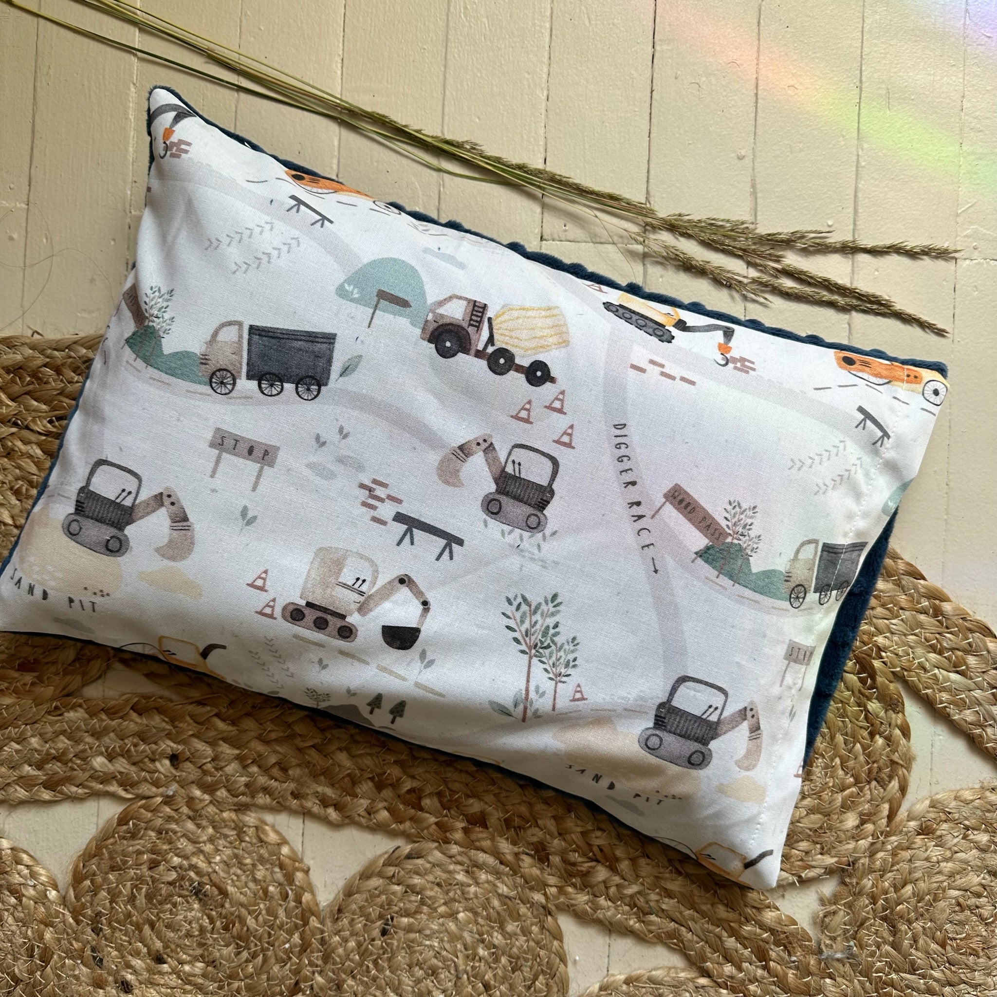La taie et l’oreiller vide peuvent aller à la laveuse et à la sécheuse. L’oreiller devrait commencer à être utilisé vers l’âge de 2 ans, soit en même temps que le passage de la couchette au lit de transition ou grand lit. La couleur de minky peut varier , m’aviser avant la commande